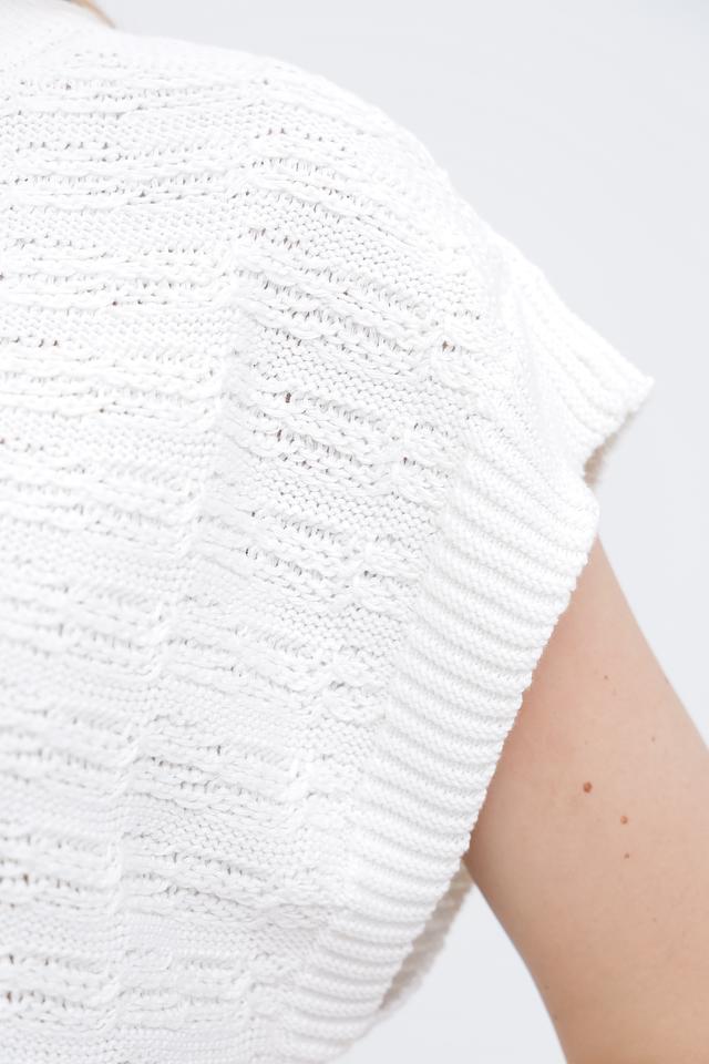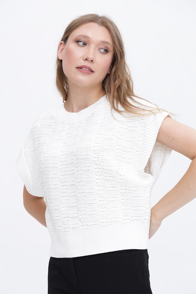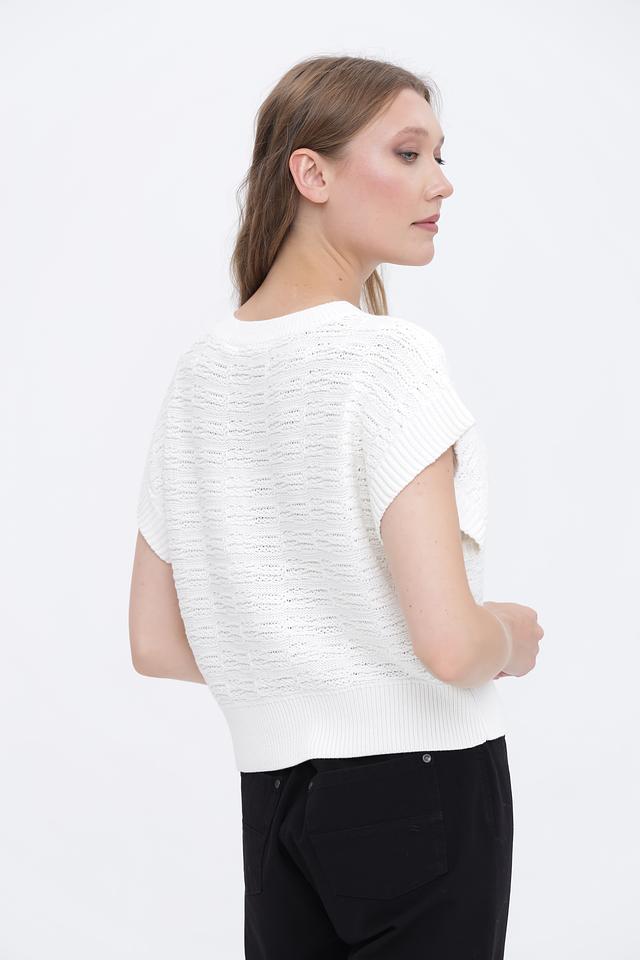 Модель имеет свободный крой и короткие рукава, что делает ее идеальной для теплой погоды или для создания многослойных образов. Текстурная вязка придает пуловеру особый шарм и оригинальность.
