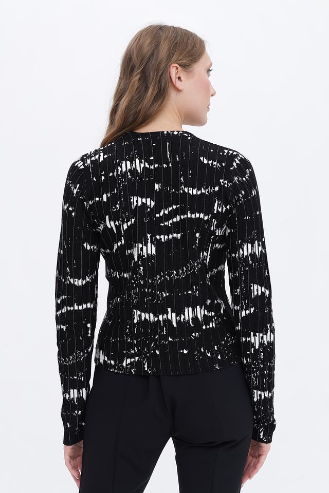 Пуловер имеет слегка приталенный силуэт, который подчеркивает фигуру. Он идеально сочетается с брюками, юбками и джинсами, позволяя создавать как повседневные, так и более элегантные комплекты.