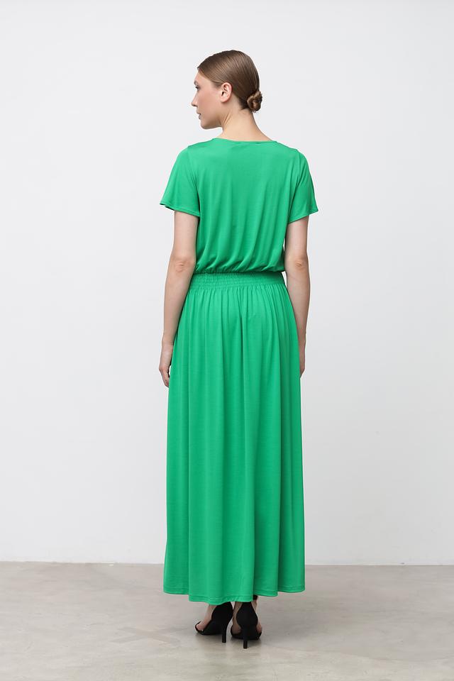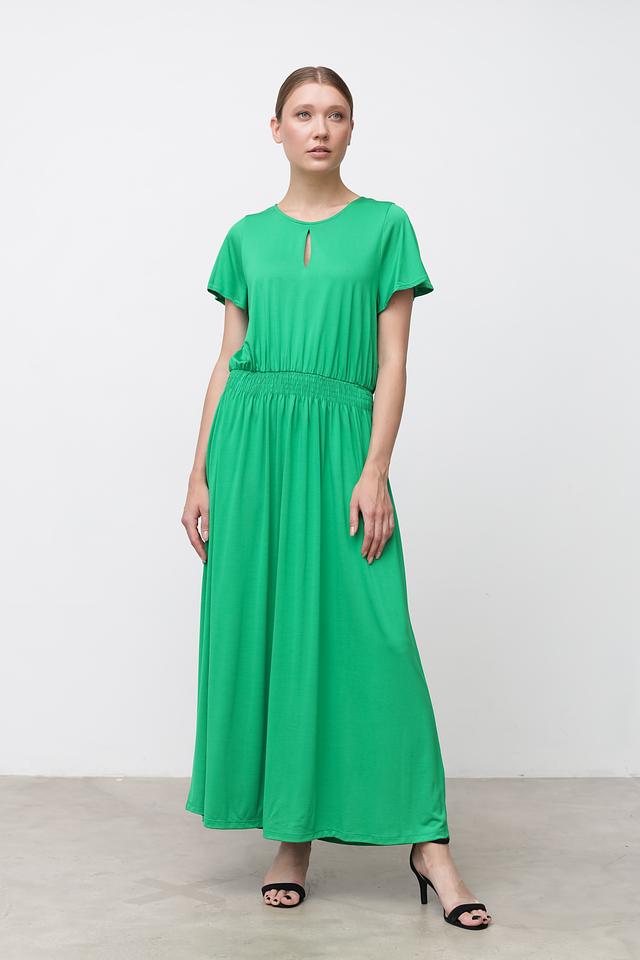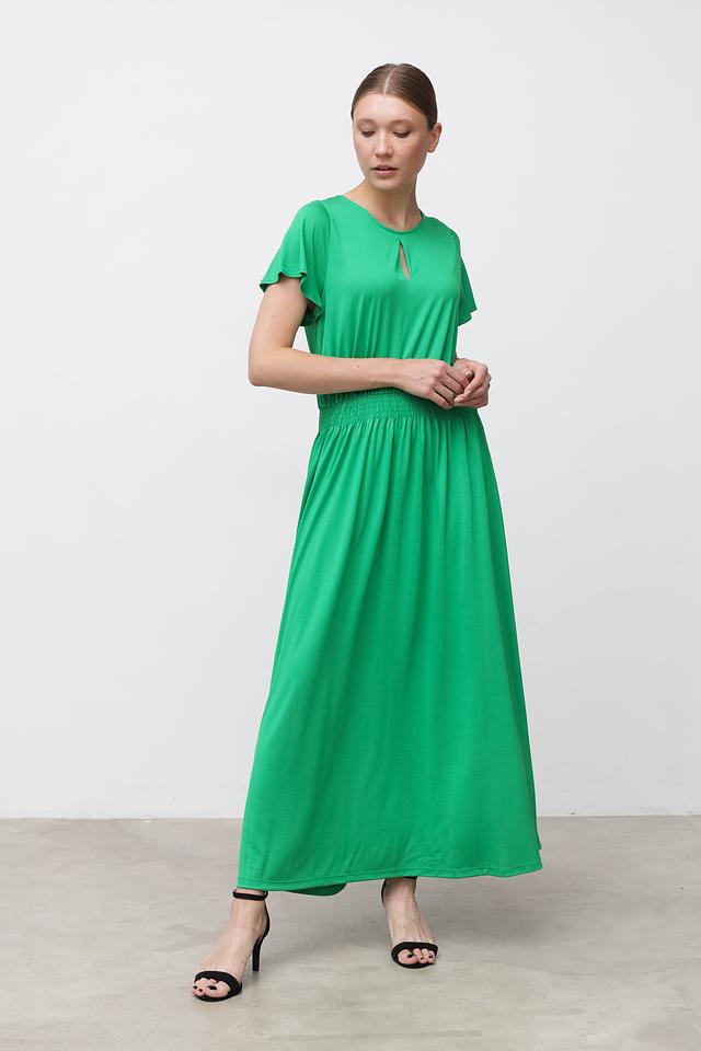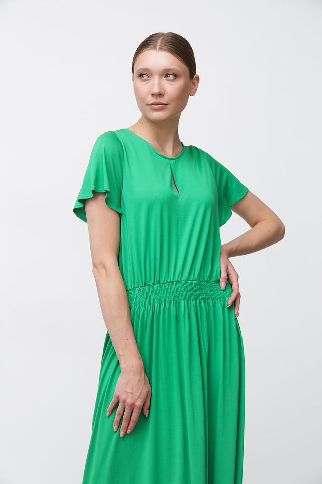 Модель отличается удобным кроем с эластичной резинкой на талии, которая обеспечивает комфортную посадку по фигуре. Короткие рукава-воланы добавляют образу лёгкости и романтичности. Вырез горловины оформлен небольшим разрезом, что делает платье более интересным и привлекательным.