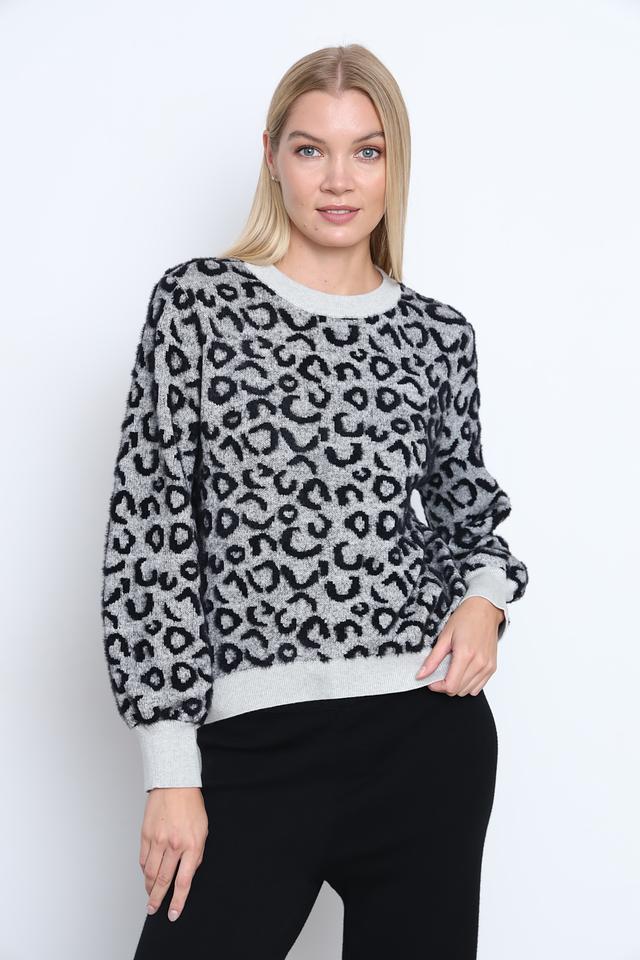 Пуловер имеет свободный крой, который не сковывает движений и позволяет создать расслабленный силуэт. Округлый вырез горловины и длинные рукава с манжетами обеспечивают дополнительный комфорт. Основной цвет пуловера – серый, а ярким акцентом является эффектный леопардовый принт, который добавляет образу динамичности и оригинальности.