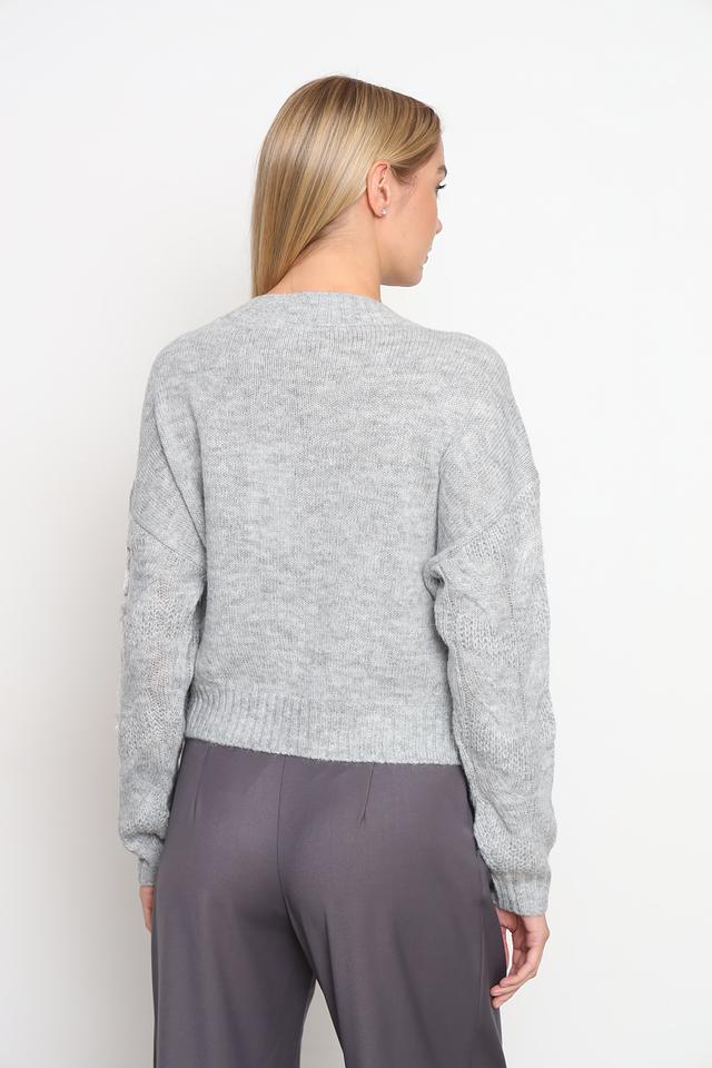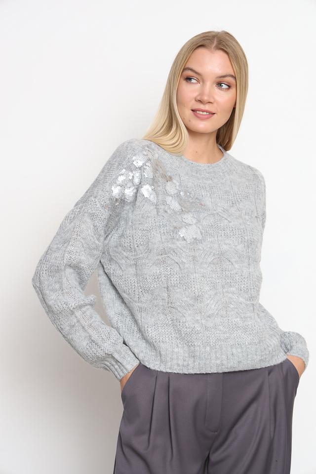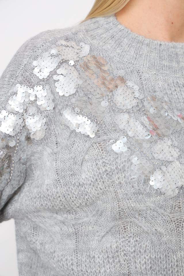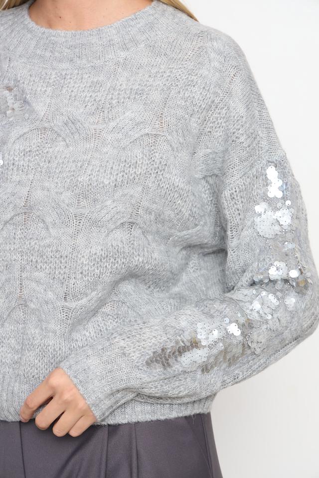 Модель имеет классический крой с круглым вырезом горловины и длинными рукавами. Особый акцент сделан на декоративные элементы – пайетки, которые расположены на плечах и рукавах, придавая изделию праздничный вид. Узор "косы" добавляет текстуры и объема.