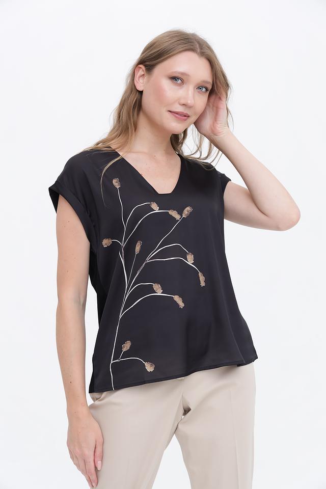 Эта блуза от Taifun – идеальный выбор для создания элегантного и непринужденного образа. Выполнена в чёрном цвете и украшена стильным растительным принтом белого и бежевого оттенков.