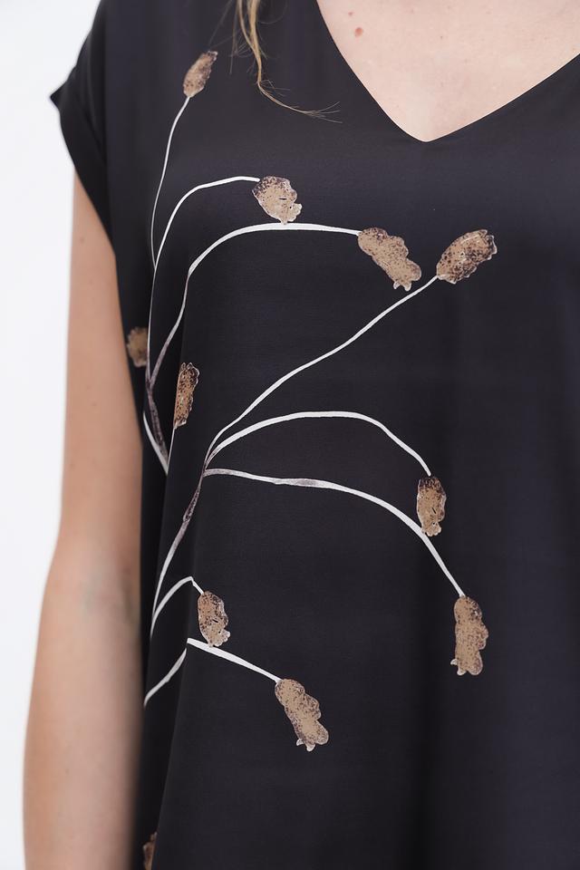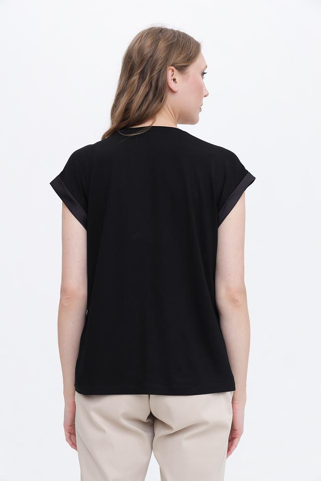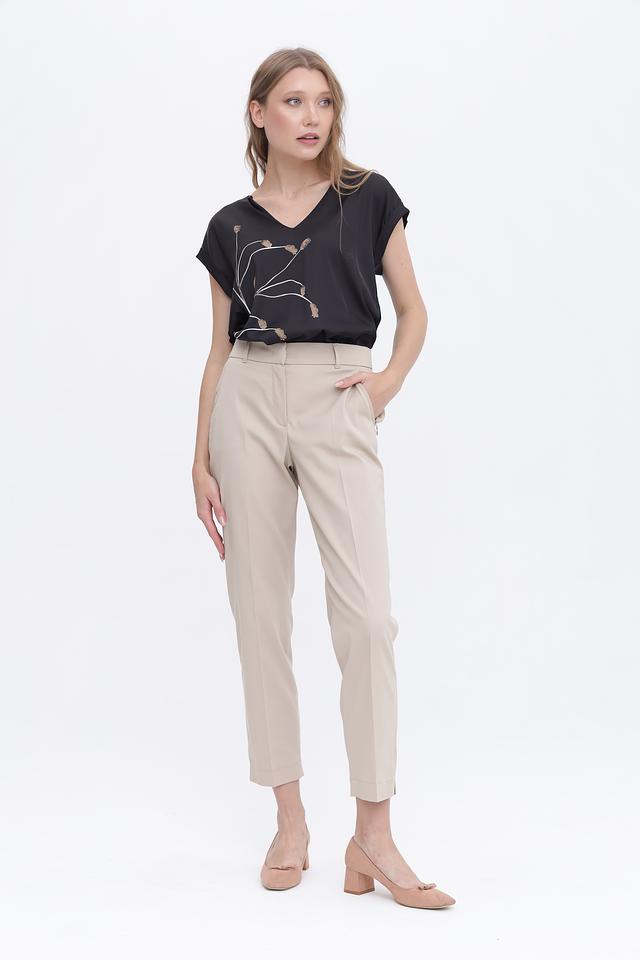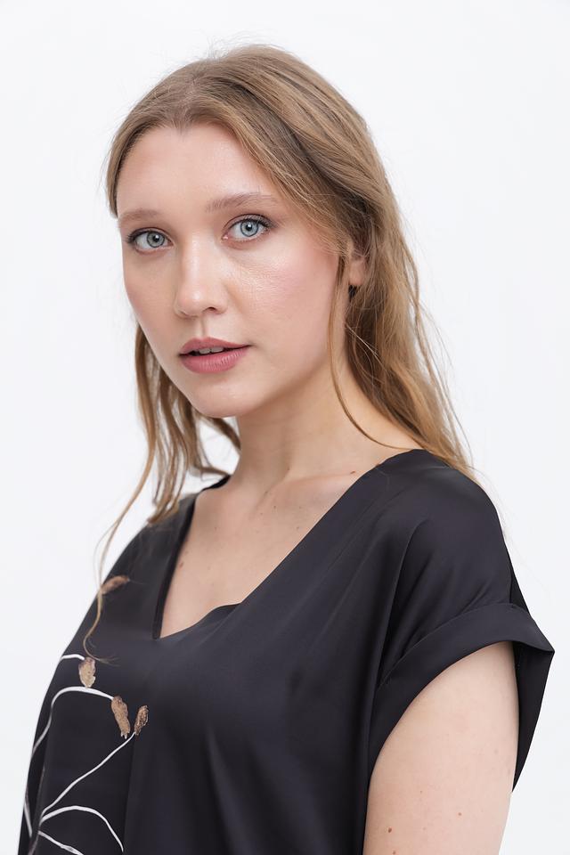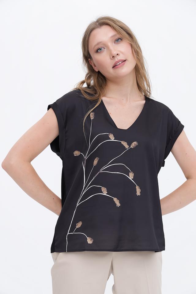 Блуза имеет свободный крой, V-образный вырез горловины и короткие рукава с манжетами, которые можно зафиксировать или оставить свободными. Материал – приятная к телу вискоза с небольшим добавлением эластана, благодаря чему блуза хорошо драпируется и не мнется.