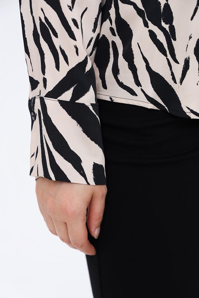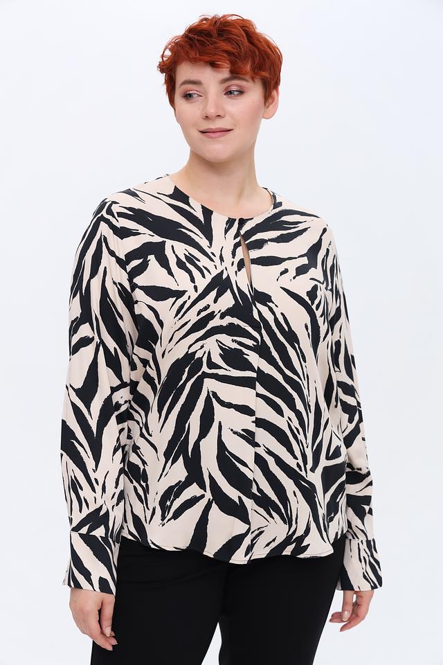 Эта блуза от Taifun – отличный выбор для создания элегантного и современного образа. Блуза выполнена в бежевом цвете с эффектным принтом, имитирующим шкуру зебры, что придает ей особую изюминку.