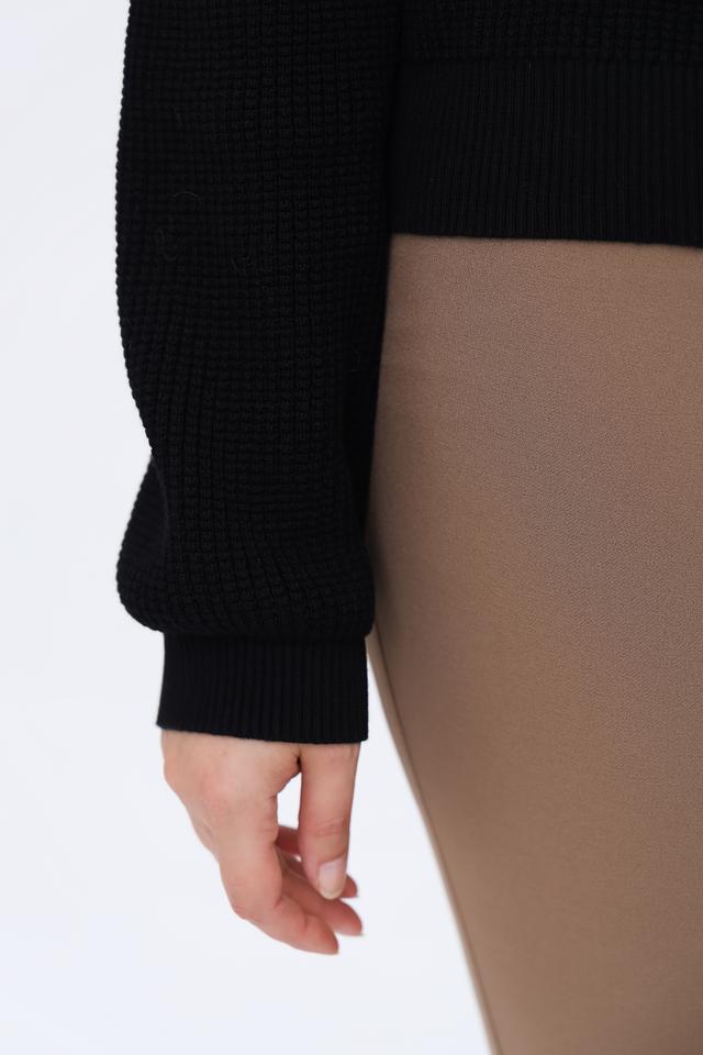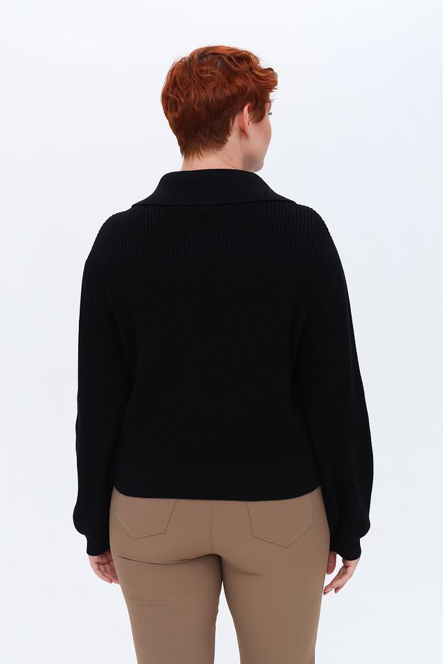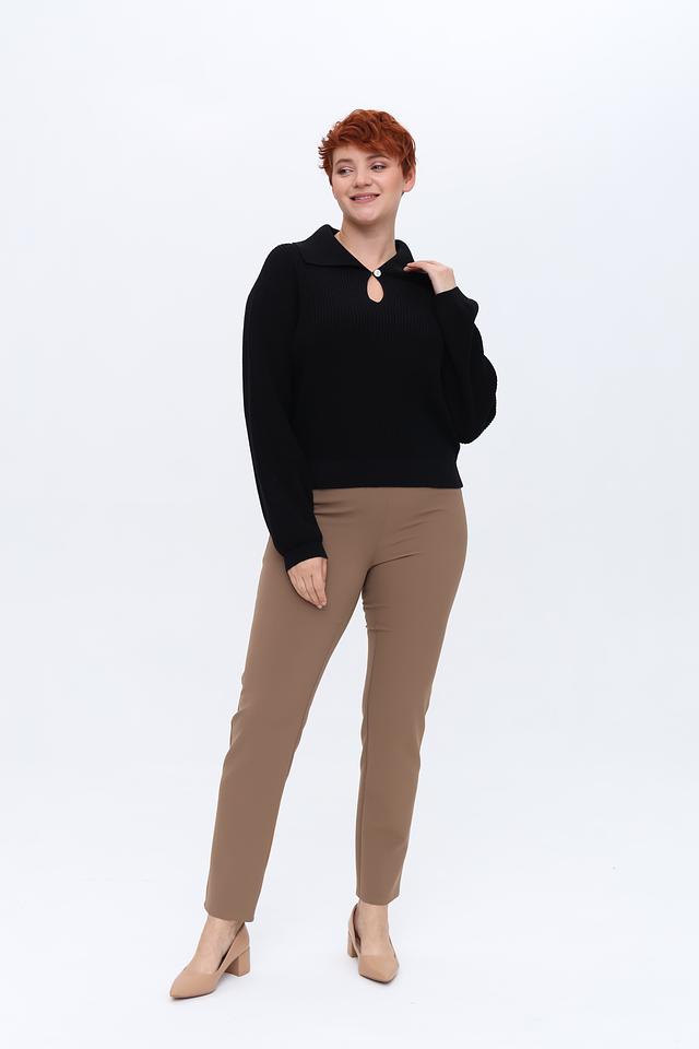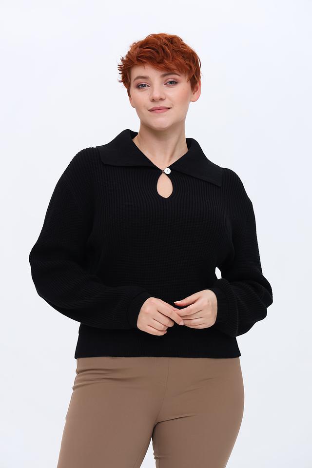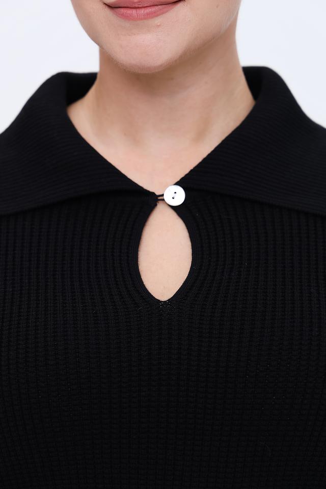 Пуловер имеет воротник-стойку, который придает ему элегантный вид. Оригинальная деталь – небольшая застёжка на пуговицу в области горловины, создающая аккуратный вырез. Вязаная текстура придает изделию объём и фактурность.
