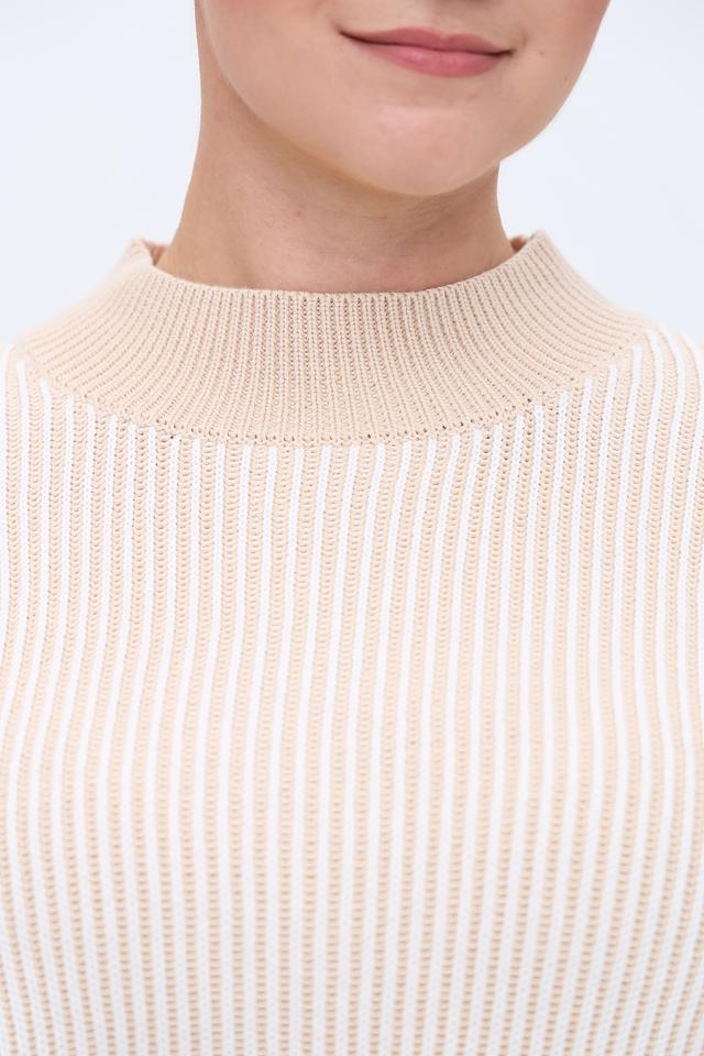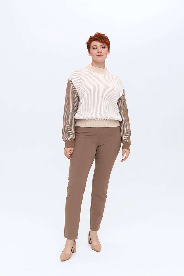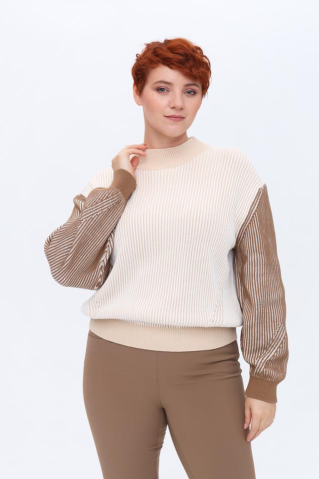 Пуловер имеет круглый вырез горловины и длинные рукава. Вертикальные полосы на рукавах визуально вытягивают силуэт, делая образ более изящным. Бежевый цвет легко сочетается с другими элементами гардероба, позволяя создавать разнообразные стильные образы.