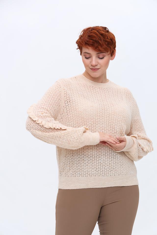 Пуловер имеет ажурный узор, который придает ему легкость и воздушность. Декоративные воланы на рукавах добавляют образу женственности и оригинальности. Круглый вырез горловины и свободный крой обеспечивают комфортную посадку по фигуре.