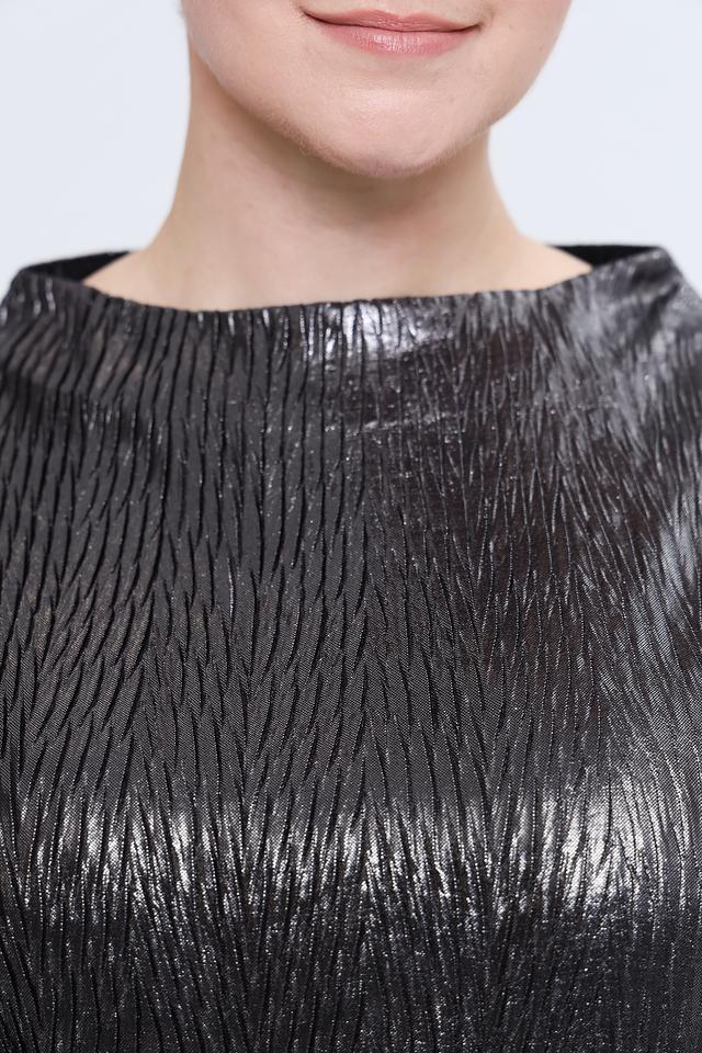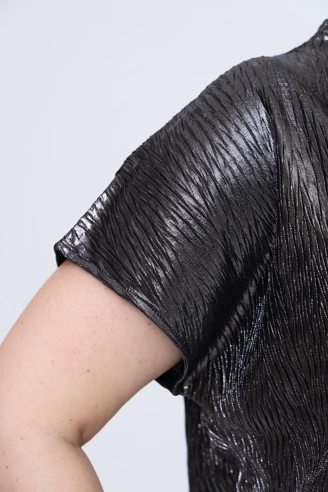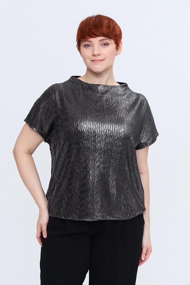 Особенностью данной модели является её эффектный металлический блеск, который придает ей праздничный и современный вид. Округлый вырез горловины и короткие рукава делают блузу универсальной и подходящей для различных случаев.