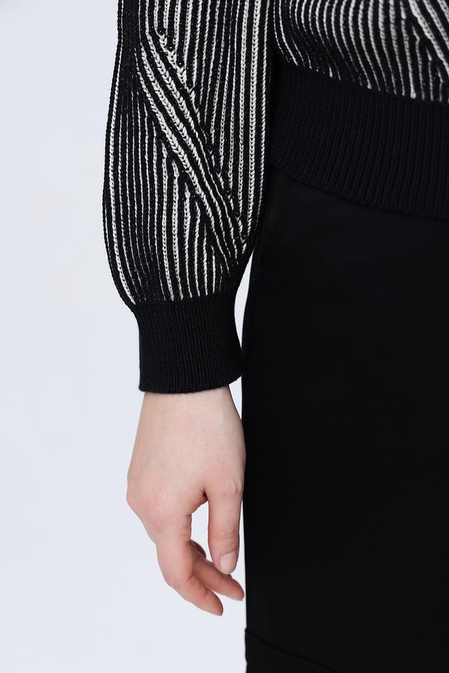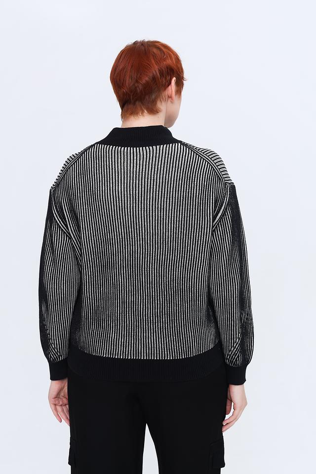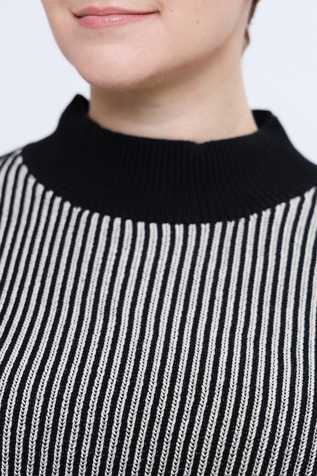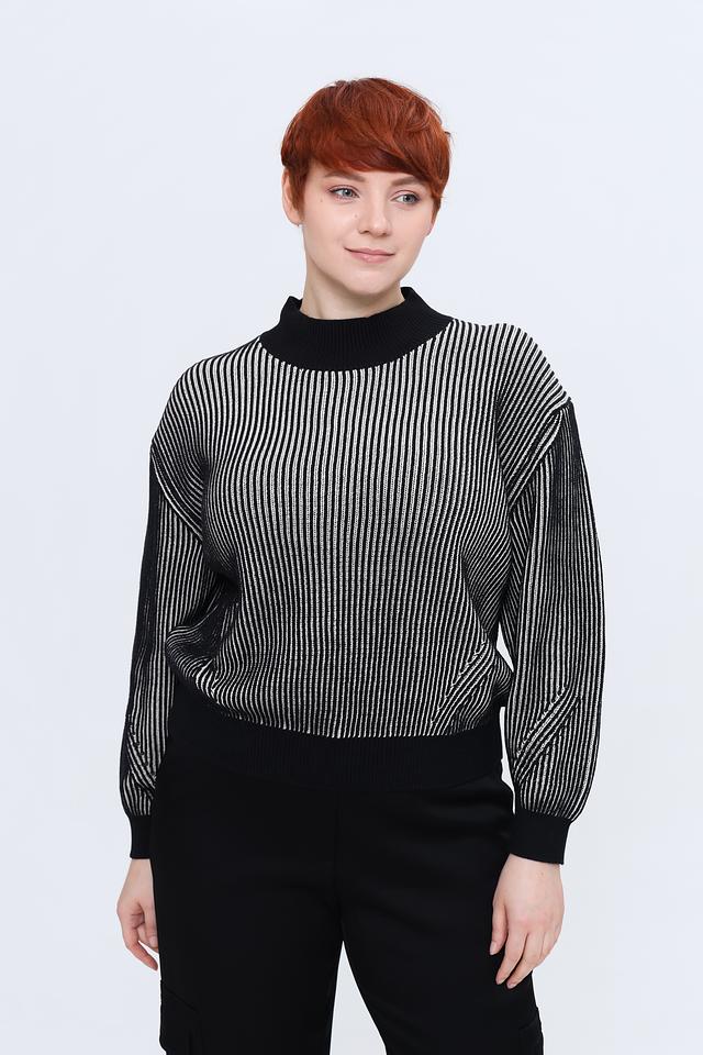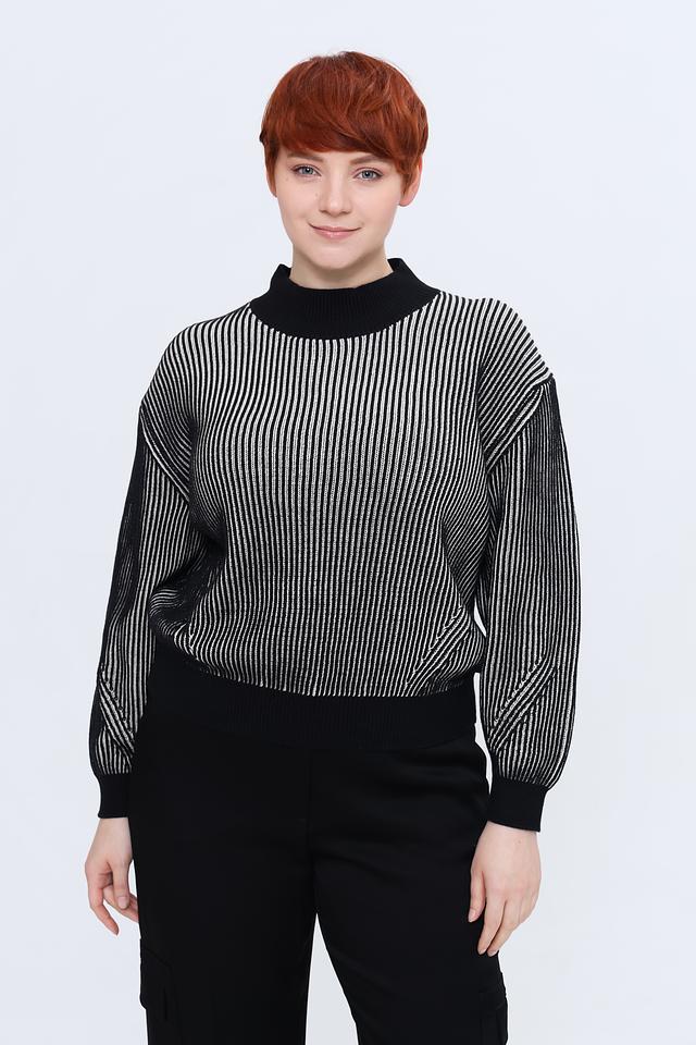Женский пуловер Taifun чёрно-белого цвета с вертикальной полоской и высоким горлом. Модель выполнена из мягкого хлопка с добавлением полиэстера и металлизированного волокна для придания лёгкого блеска. Состав: хлопок 95%, полиэстер 3%, металлизир. волокно 2%