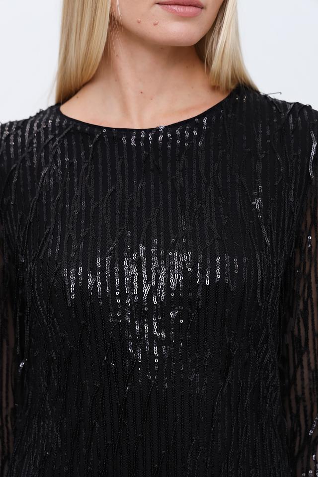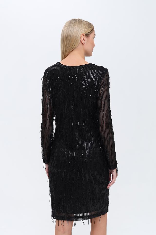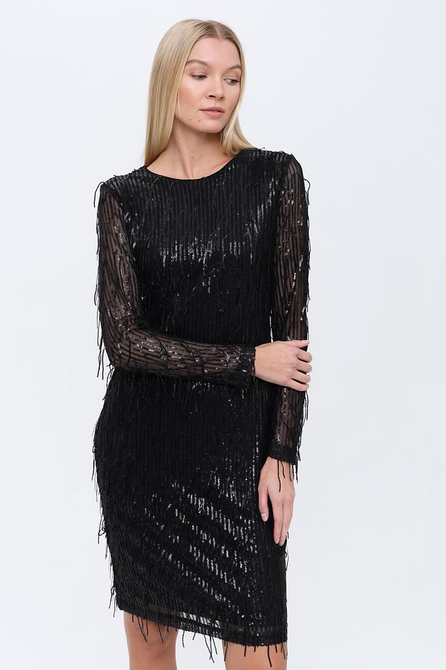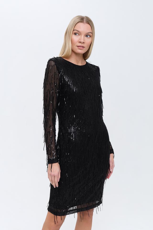 Основным декоративным элементом является бахрома, которая покрывает всю поверхность платья, создавая эффектный и динамичный образ. Рукава платья длинные, также украшены бахромой. Вырез горловины округлый.