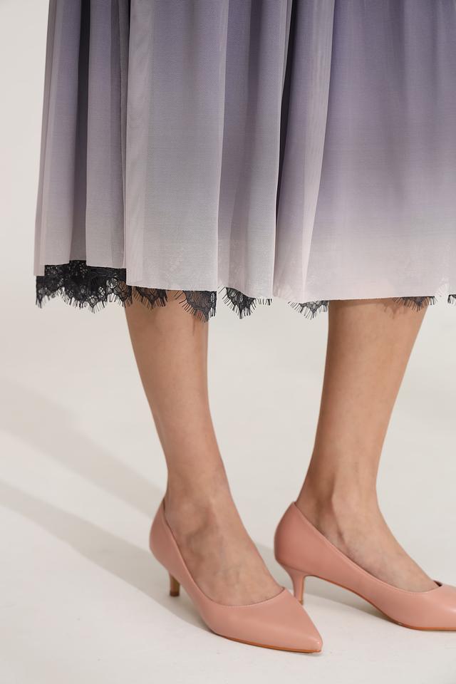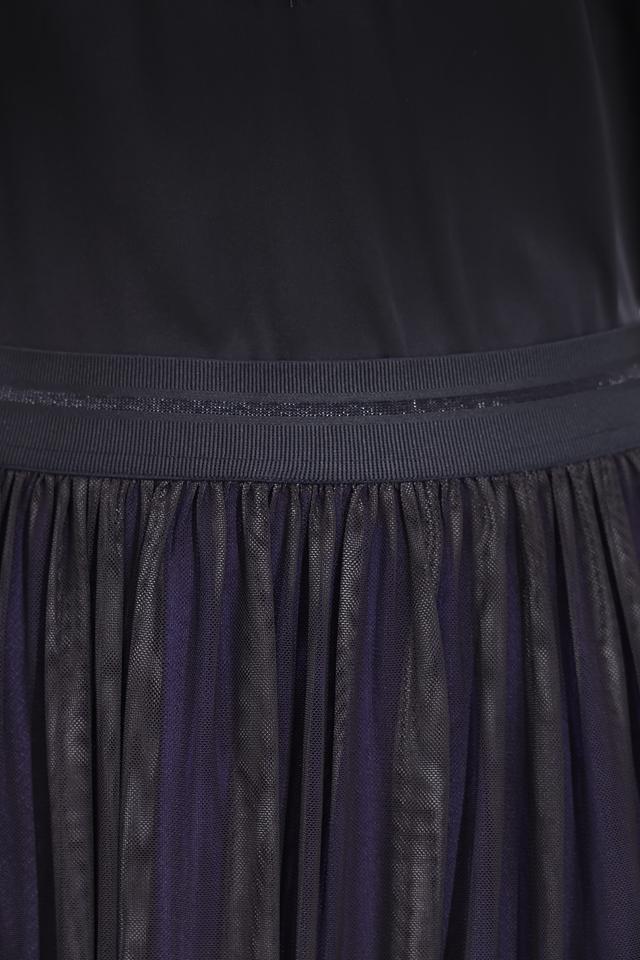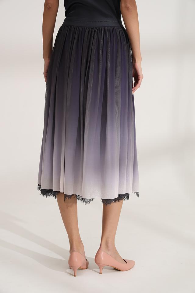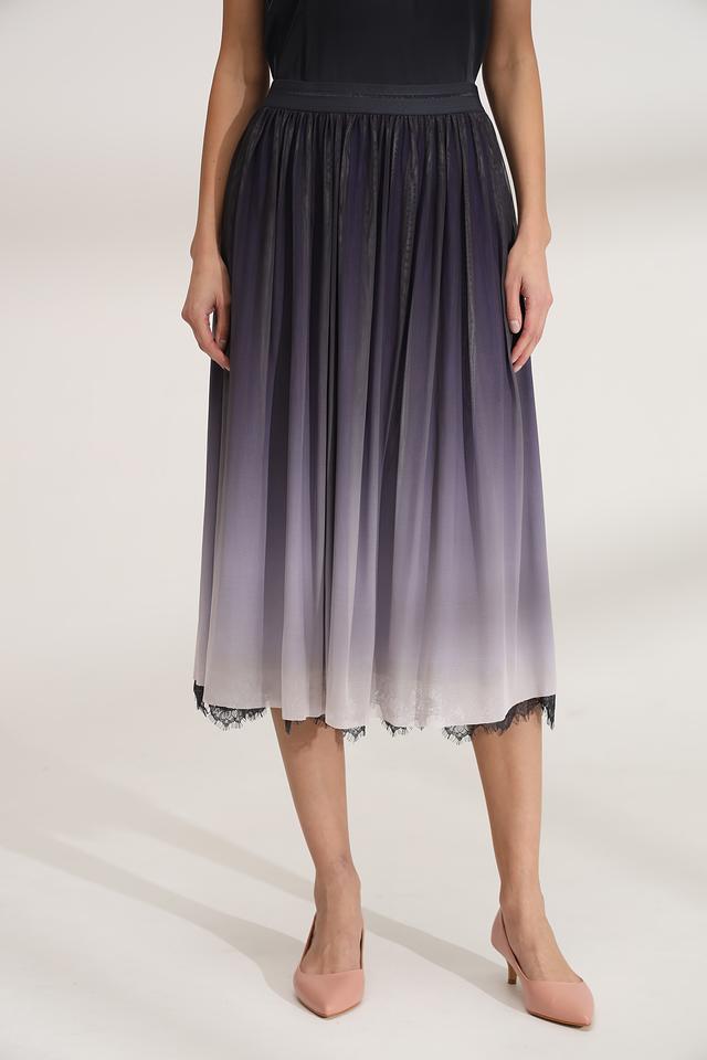 Юбка имеет эффектный градиентный окрас – от тёмного оттенка в верхней части к светлому внизу, создающий визуально удлиняющий силуэт. Декоративная кружевная отделка по низу добавляет юбке романтичности и утонченности.