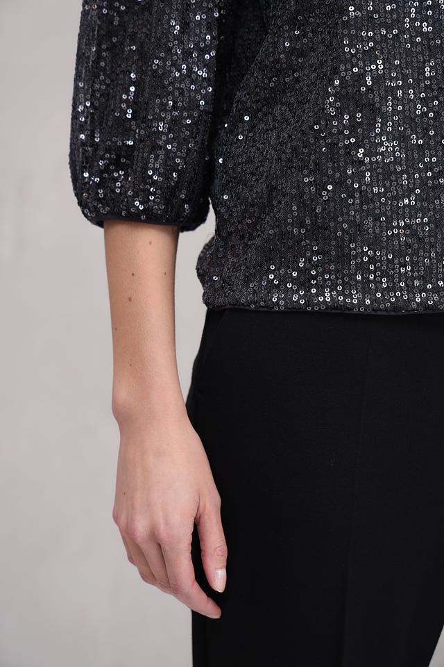 Блуза полностью покрыта мерцающими пайетками, которые создают эффектный блеск и привлекают внимание. Округлый вырез горловины и рукава длиной 3/4 придают модели элегантность и женственность. Свободный крой обеспечивает свободу движений и позволяет создать расслабленный, но при этом изысканный силуэт.