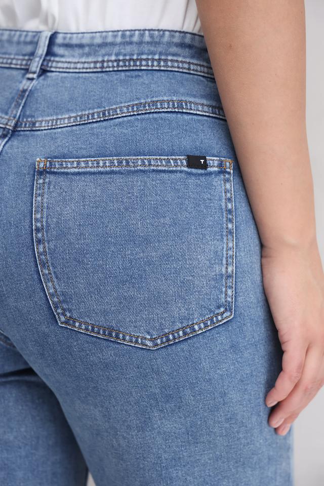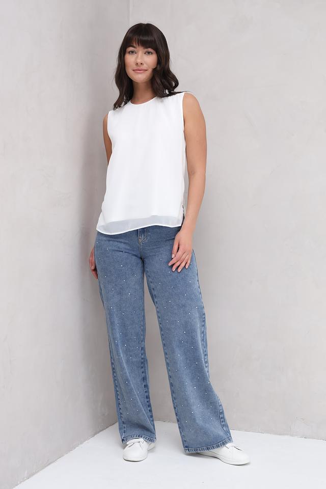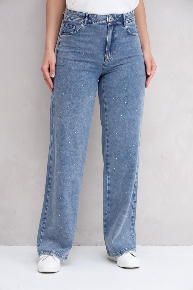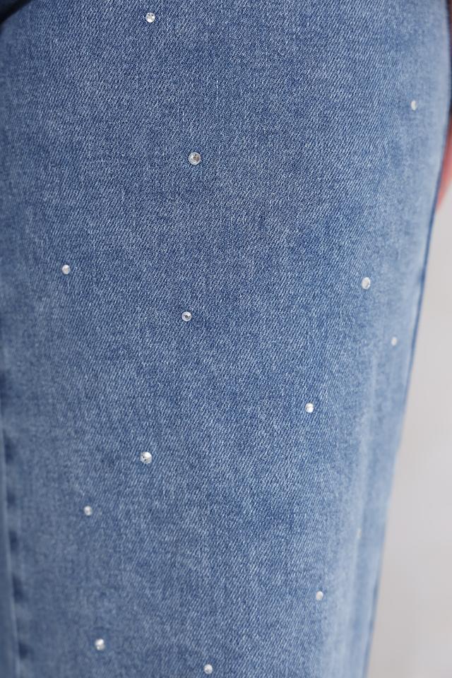 Особенностью модели является декор в виде жемчужных бусин, которые придают джинсам изысканный и современный вид. Джинсы имеют стандартную посадку на талии и застежку на молнию и пуговицу.