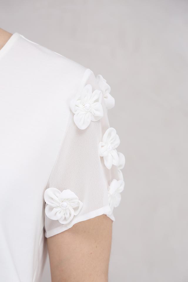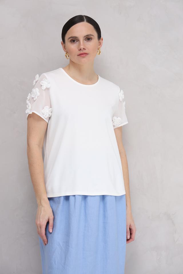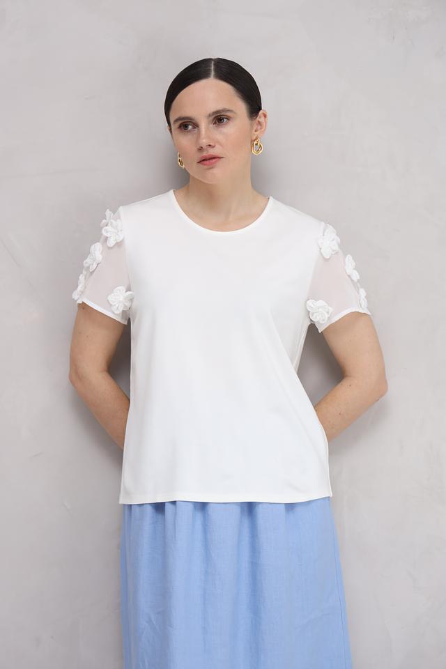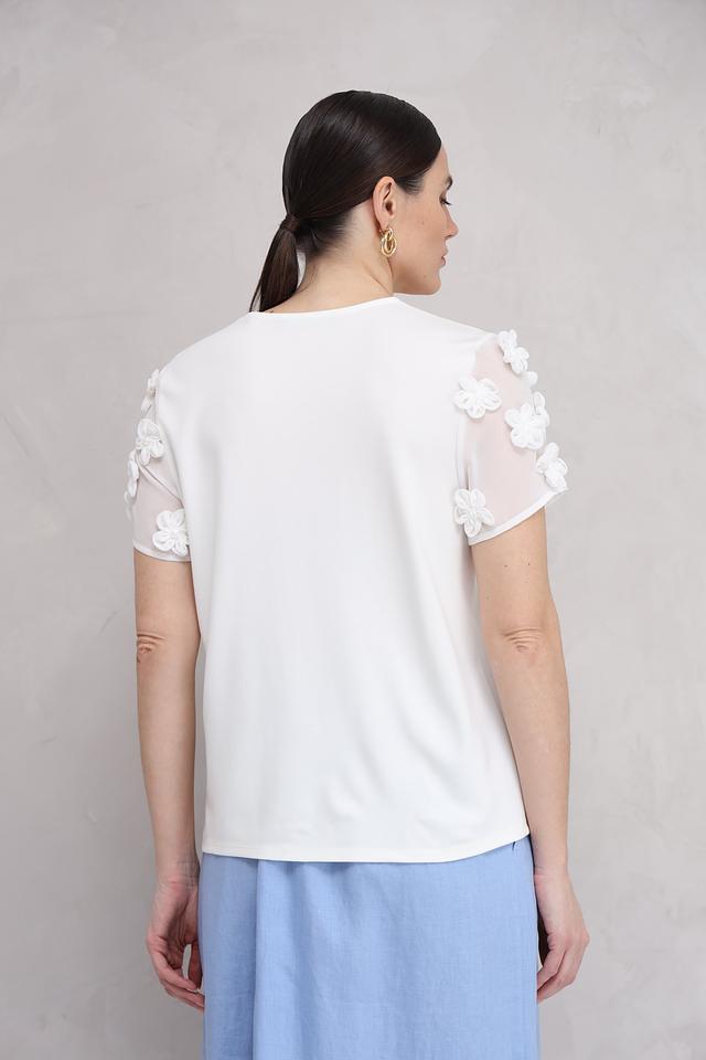 Особенностью данной блузы является декор в виде объемных цветов на рукавах, выполненных из полупрозрачной ткани. Короткие рукава добавляют легкости и воздушности.