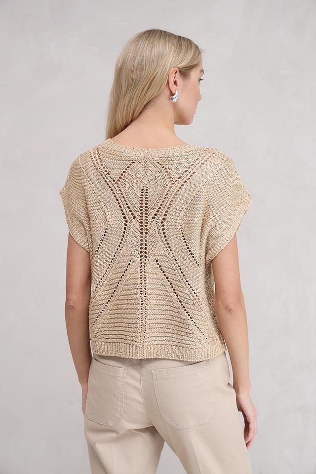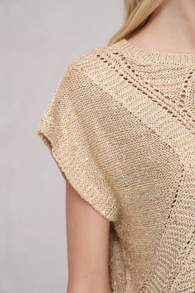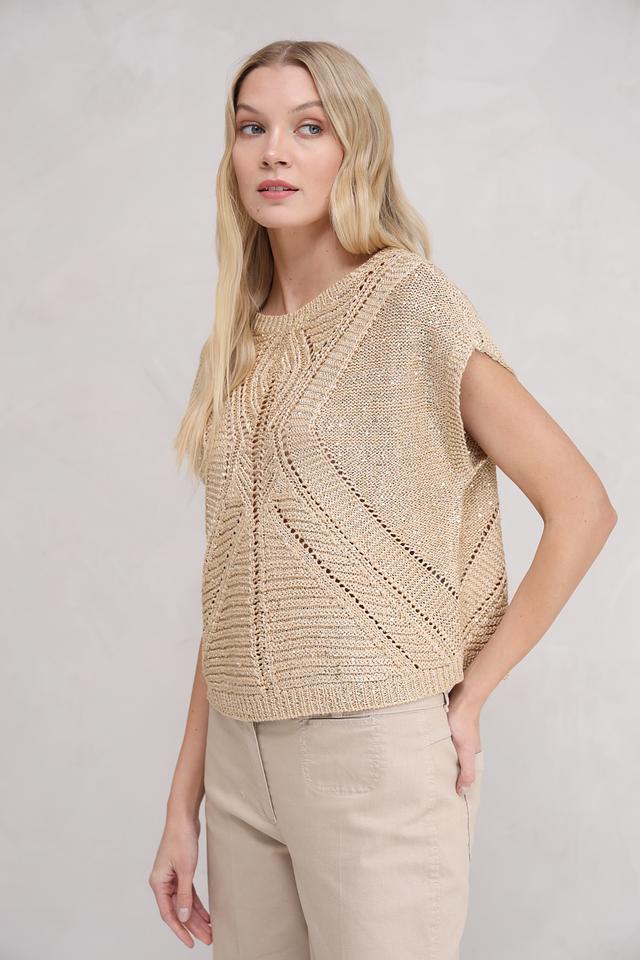 Бежевый пуловер от Taifun с коротким рукавом и ажурной вставкой на горловине и переде. Модель выполнена из мягкого трикотажа с добавлением металлизированных волокон, что придает изделию легкий блеск. Состав: полиакрил 57%, полиэстер 40%, металлизир. волокно 3%