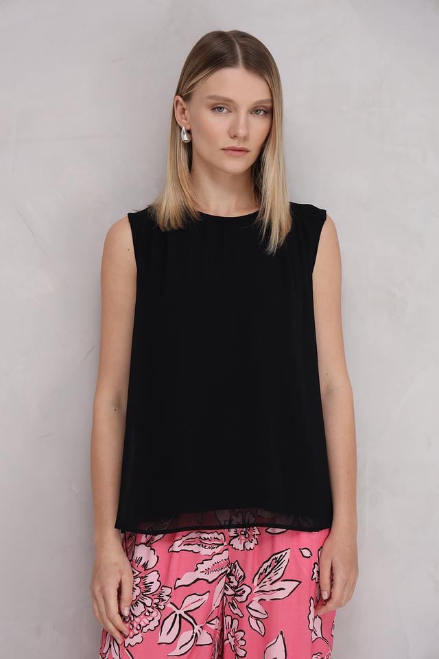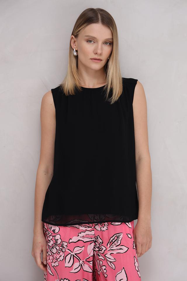 Топ имеет прямой крой и небольшие плечи, что придает ему элегантный вид. Круглый вырез горловины и отсутствие рукавов делают его идеальным для теплой погоды.