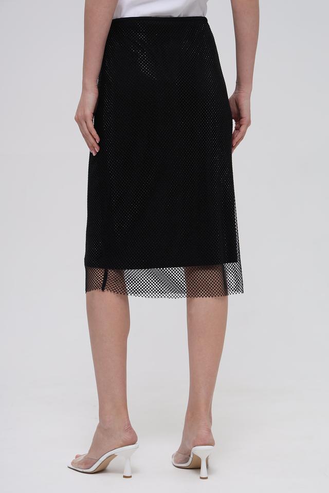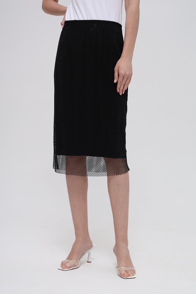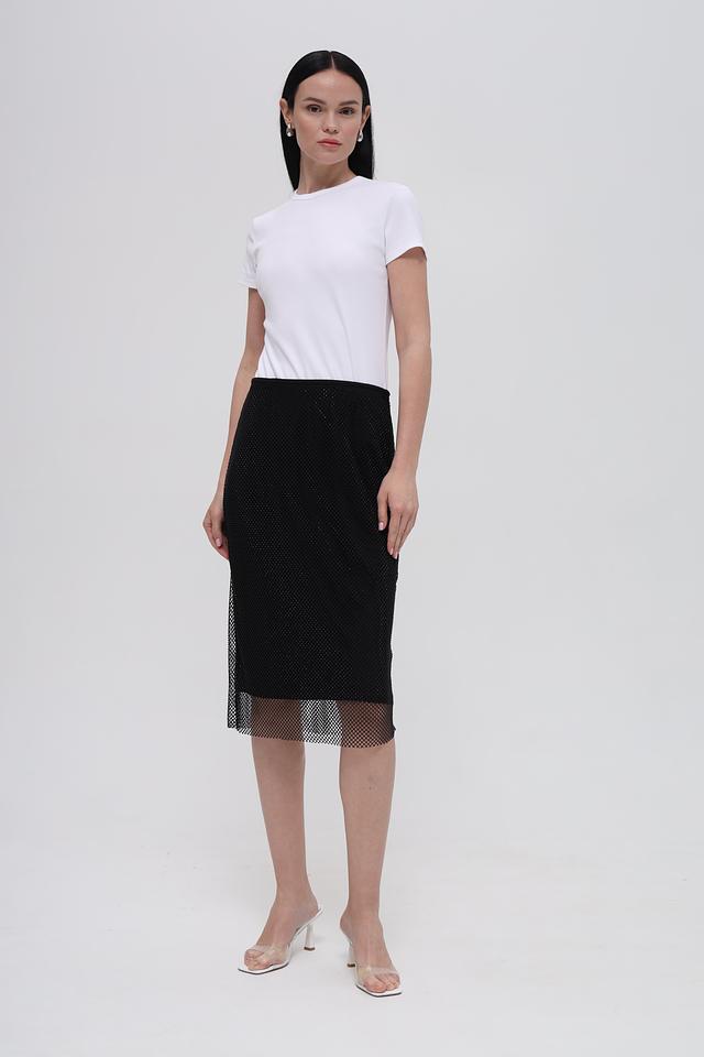 Юбка имеет классическую длину миди и приталенный силуэт, который подчеркивает фигуру. Верхняя часть юбки выполнена из ткани с рельефной текстурой, напоминающей мелкую сетку. Нижняя часть юбки – полупрозрачная сетка, создающая эффект многослойности и добавляющая образу воздушности.