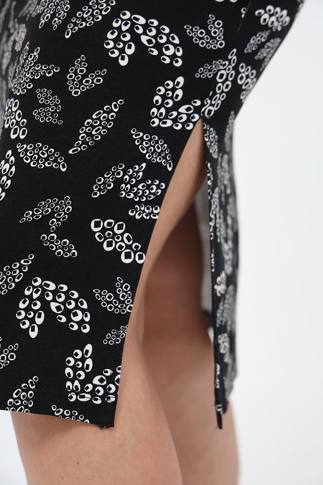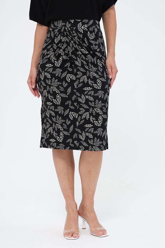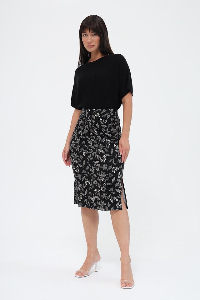 Юбка имеет классическую длину миди и облегающий силуэт, подчеркивающий достоинства фигуры. Особенностью модели является стильный цветочный принт, который добавляет образу женственности и изысканности. Небольшой разрез сзади обеспечивает свободу движений.