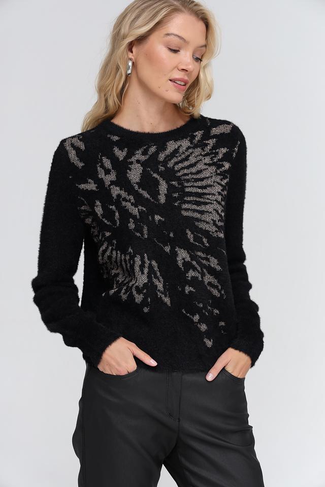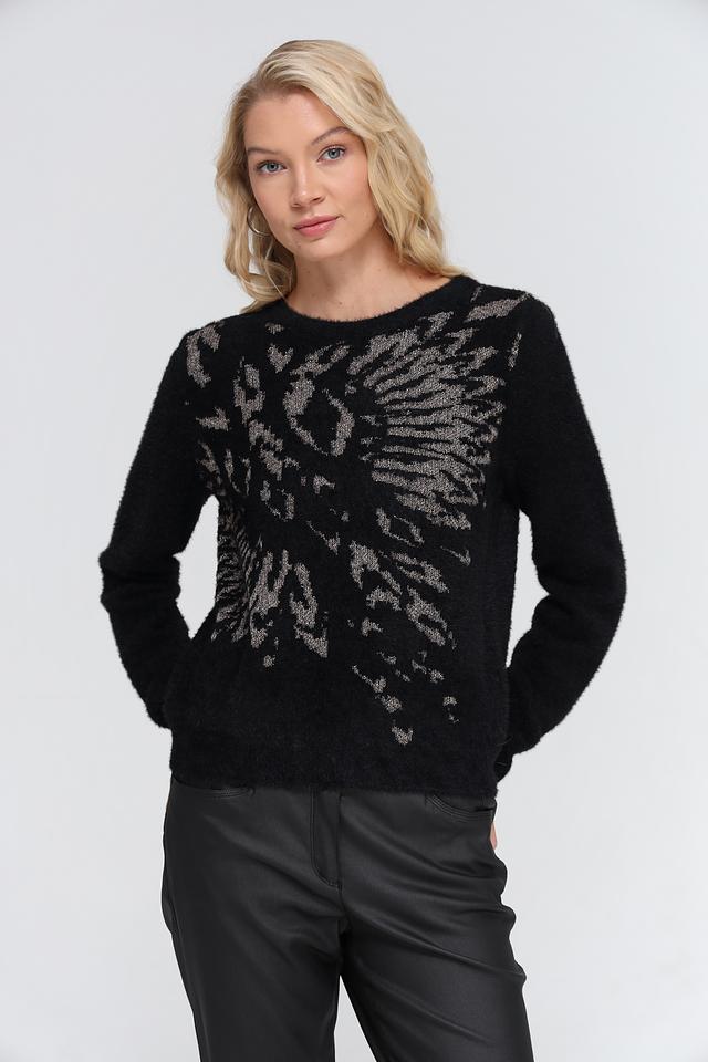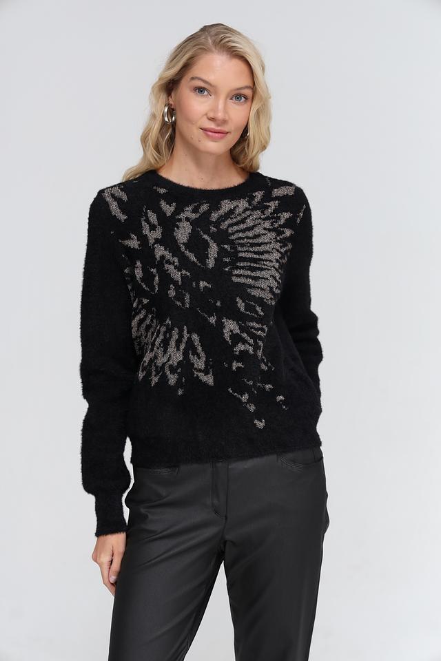 Этот стильный пуловер от Taifun станет прекрасным дополнением к вашему гардеробу. Выполненный в чёрном цвете, он украшен эффектным узором, выполненным с использованием металлизированной нити, что придает ему особый шарм и изысканность.