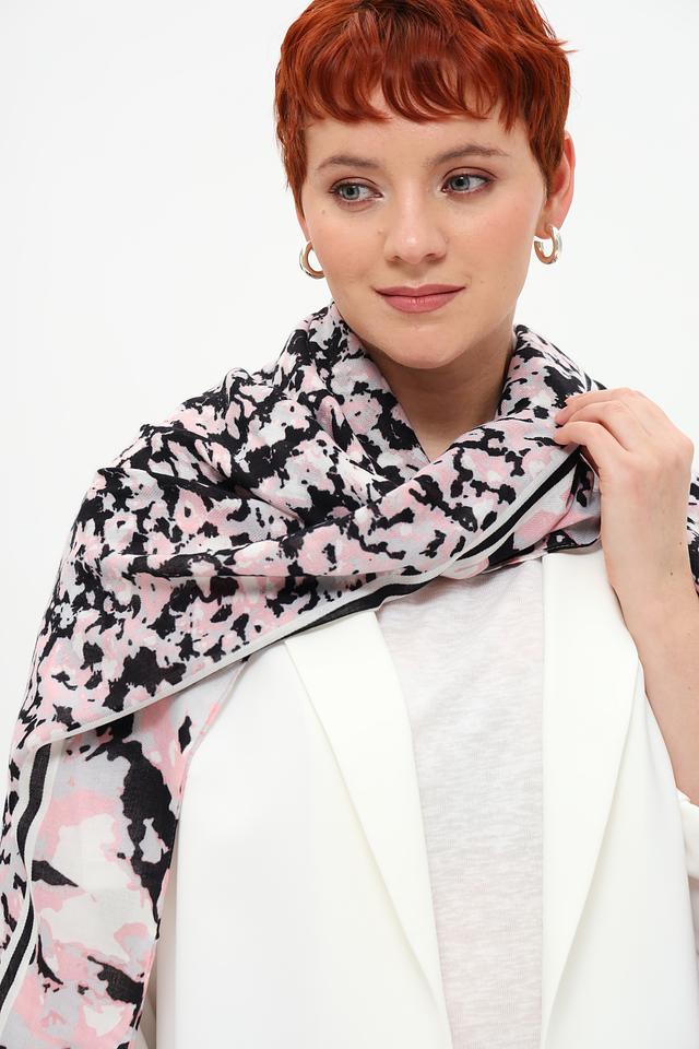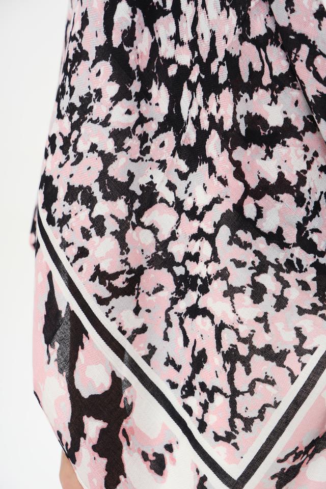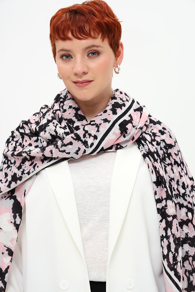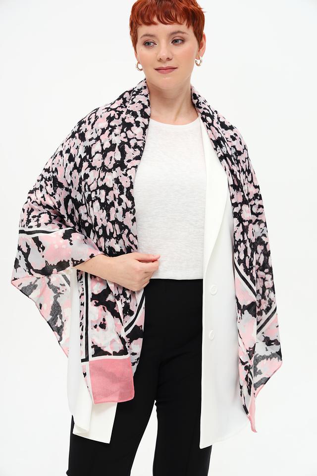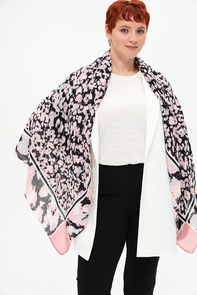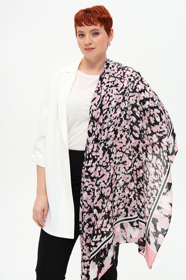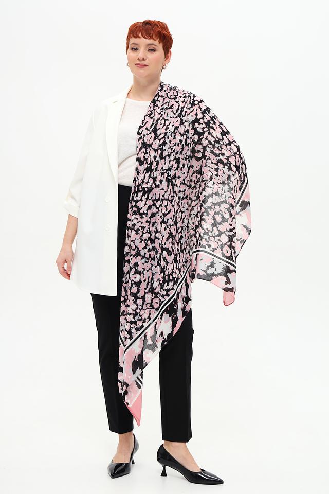 Основной цвет платка – чёрный, но он разбавлен нежными розовыми оттенками и стилизованным леопардовым принтом. Такое сочетание делает его универсальным аксессуаром, который подойдет как для повседневного, так и для вечернего образа.