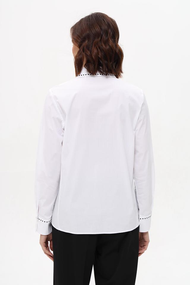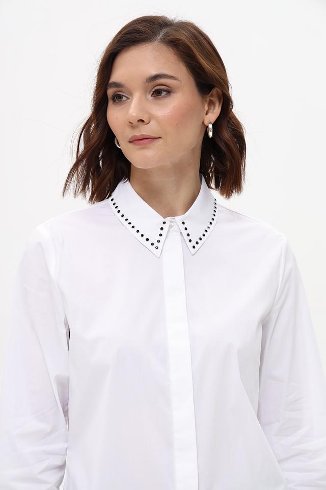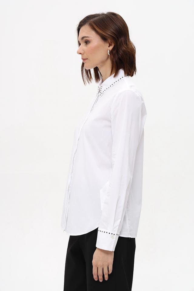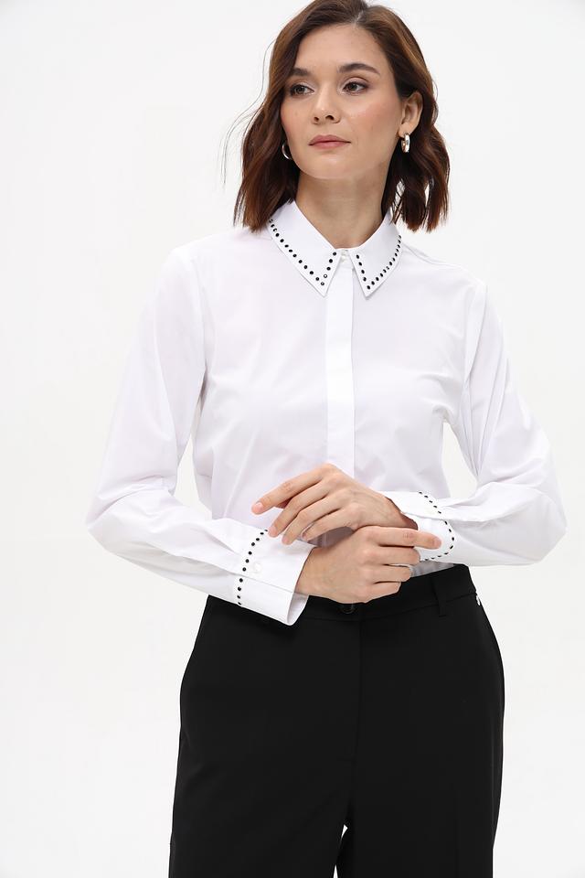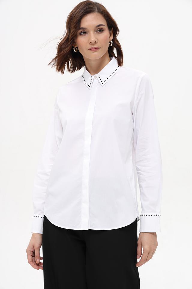 Особый акцент в дизайне – декоративная отделка в виде мелких черных точек на воротнике и манжетах, придающая рубашке изысканность и оригинальность. Рубашка идеально подойдет для работы, учебы или повседневной носки.