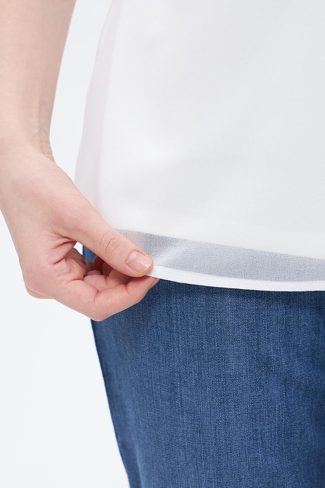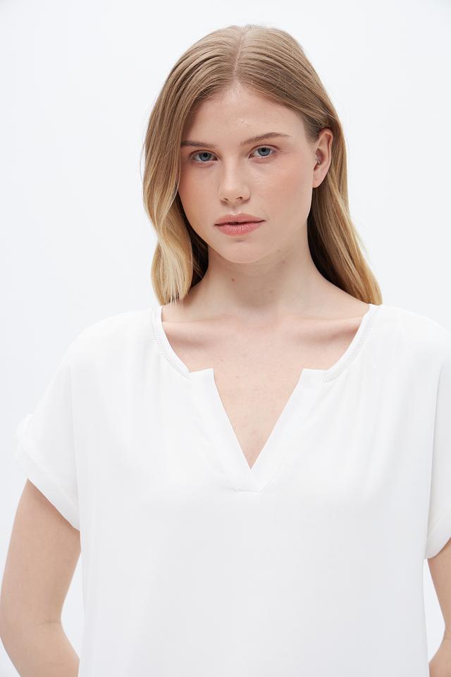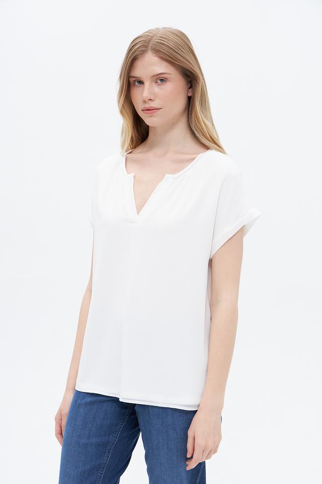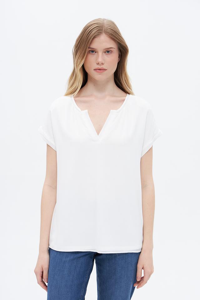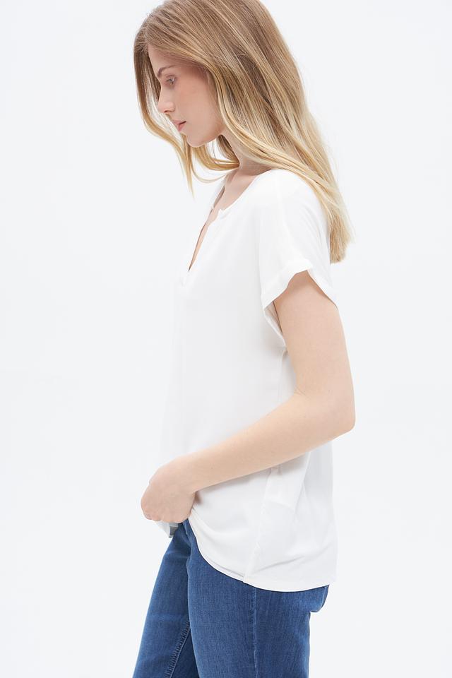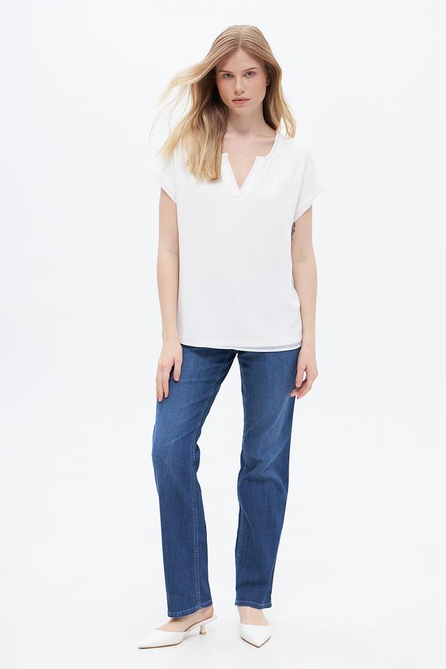 Футболка имеет прямой крой, короткие рукава с небольшими манжетами и V-образный вырез горловины. Такая конструкция подчеркивает фигуру и создает элегантный образ.