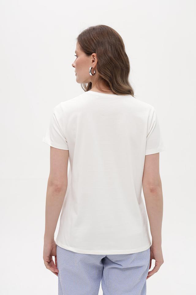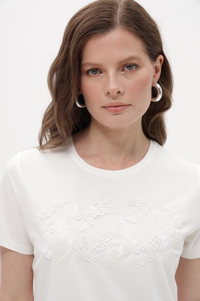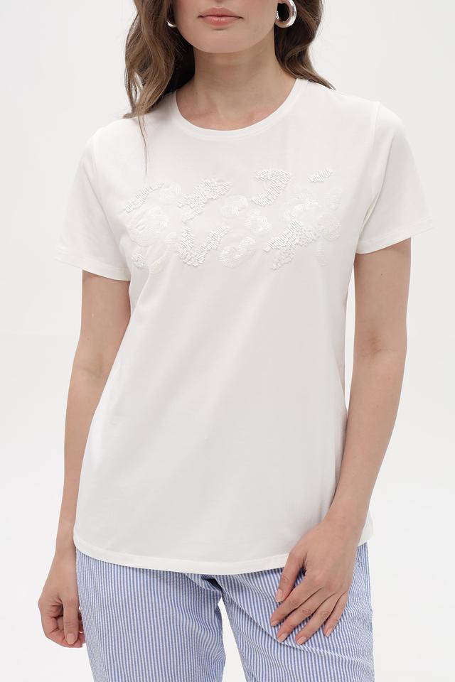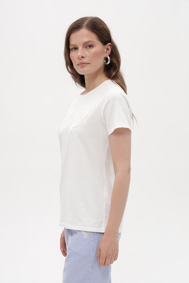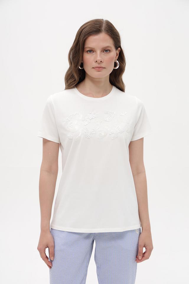 Основной цвет футболки – белый. Передняя часть украшена деликатной вышивкой, придающей изделию изысканность и оригинальность. Вышивка выполнена в светлых тонах, гармонично сочетаясь с общим дизайном.