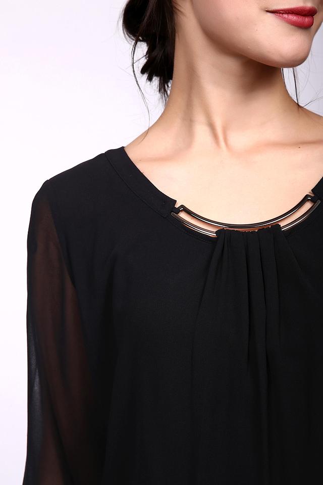 Модель имеет длинные рукава-фонарики, которые придают образу романтичность и лёгкость. Округлый вырез горловины декорирован небольшим элементом, добавляющим изысканности.