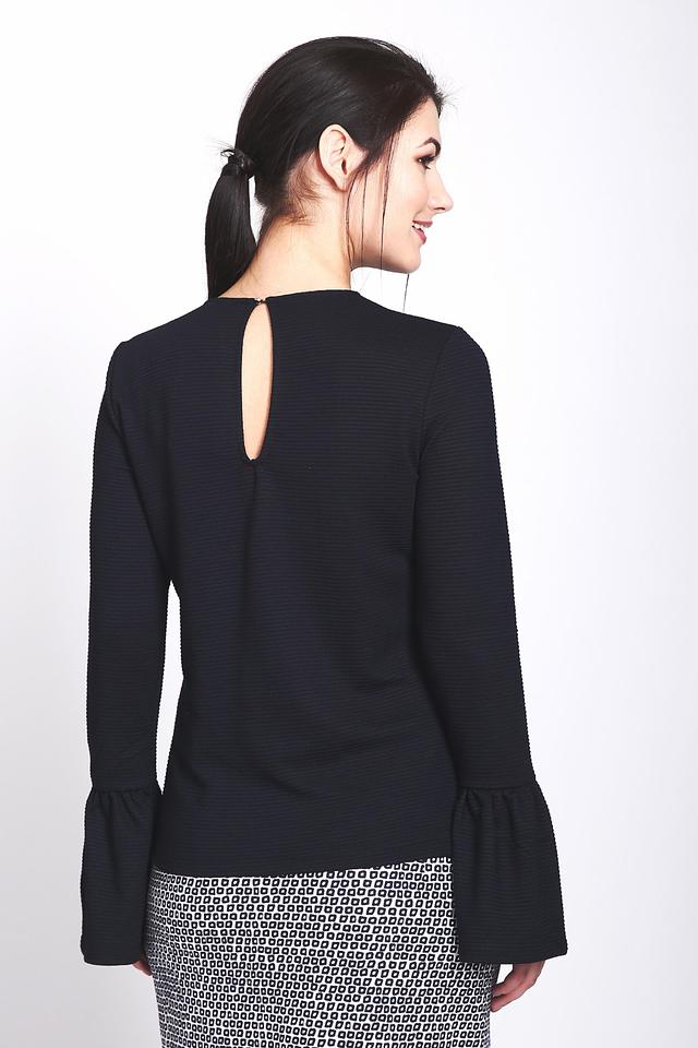 Блуза черного цвета фирмы Taifun. Ткань состоит из 3% эластана, 23% вискозы и 74% полиэстера. Модель выполнена приталенным фасоном. Блуза дополнена округлым воротом, застежка с разрезом "капля" на пуговицу, втачной, длинный рукав с манжетой "волан". Гармонировать можно с юбкой и брюками, придаст вам кокетливый образ.