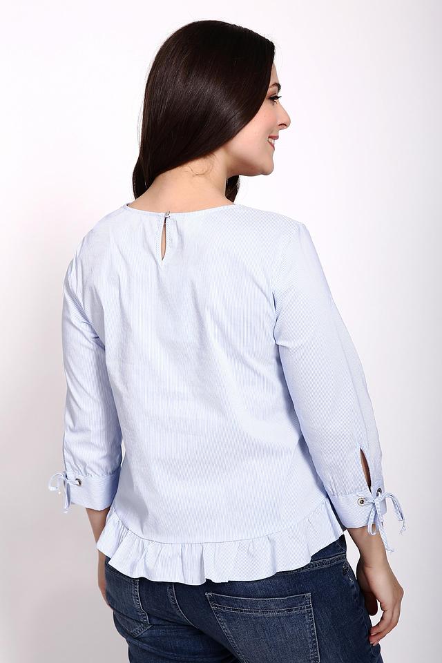 Модель имеет округлый вырез горловины и короткие рукава-фонарики, собранные на манжетах с помощью завязок. По низу блузы проходит декоративная сборка, создающая эффект волана. Спинка блузы имеет небольшой вырез с застежкой на пуговицу.