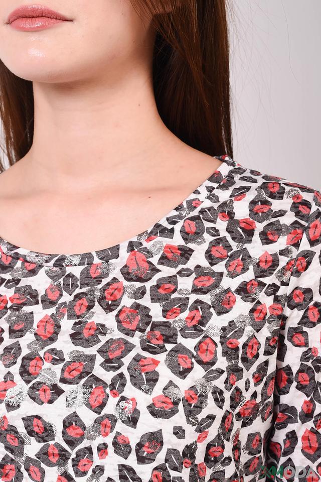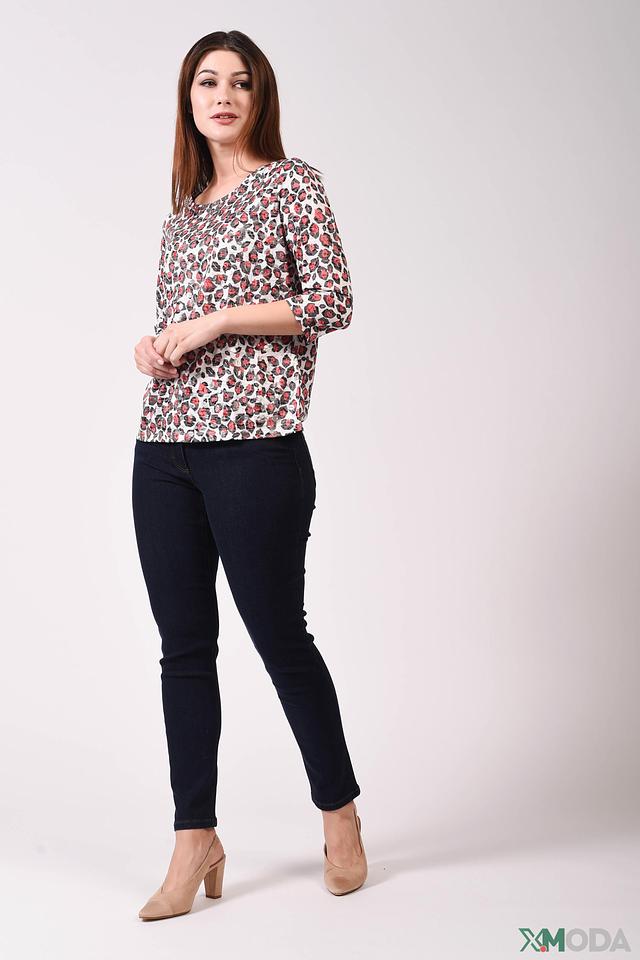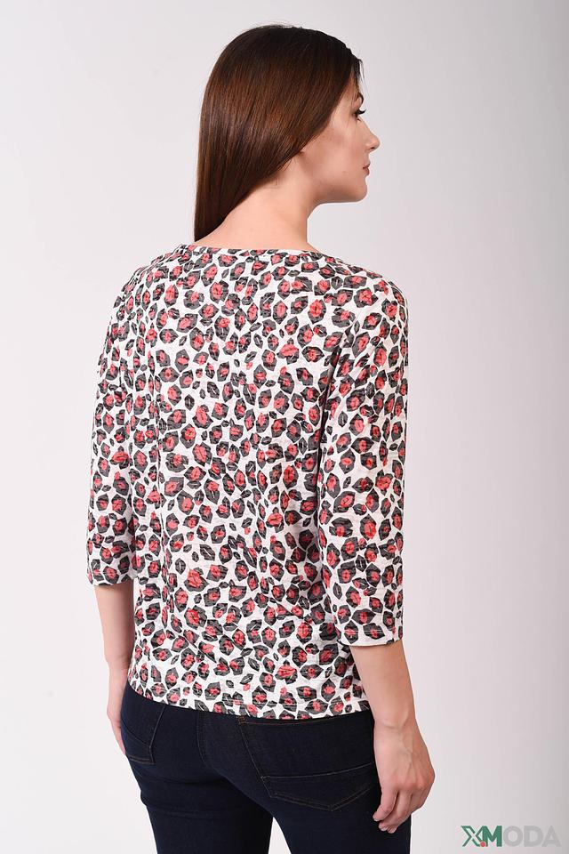 Основной цвет блузы – белый, но ее украшает эффектный леопардовый принт в красных и черных тонах. Круглый вырез горловины и рукава 3/4 придают модели классический вид.