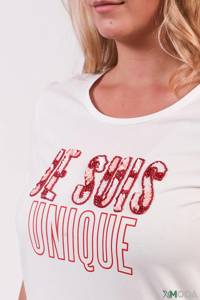 Белая футболка Taifun с ярким принтом "Je Suis Unique" станет стильным дополнением к вашему гардеробу. Изготовлена из мягкого хлопка с добавлением эластана для комфорта и свободы движений. Состав: хлопок 95%, эластан 5%