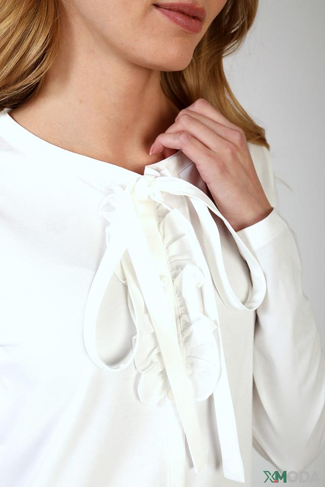 Особенностью данной модели являются декоративные завязки на горловине, которые позволяют регулировать вырез и создавать различные варианты стиля. Блуза выполнена из высококачественного материала, состоящего из хлопка, модала и эластана, что обеспечивает комфорт и удобство при носке.