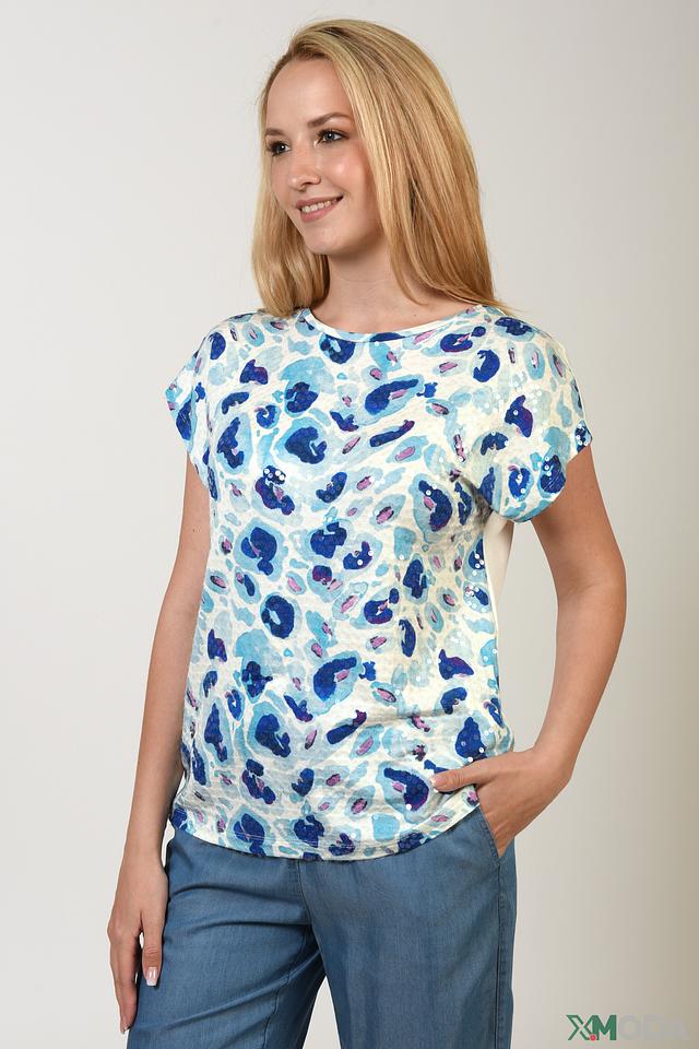 Женская футболка Taifun голубого цвета с оригинальным принтом в виде пятен. Модель выполнена из мягкой вискозы с добавлением эластана, обеспечивающего комфортную посадку по фигуре. Состав: вискоза 92%, эластан 8%