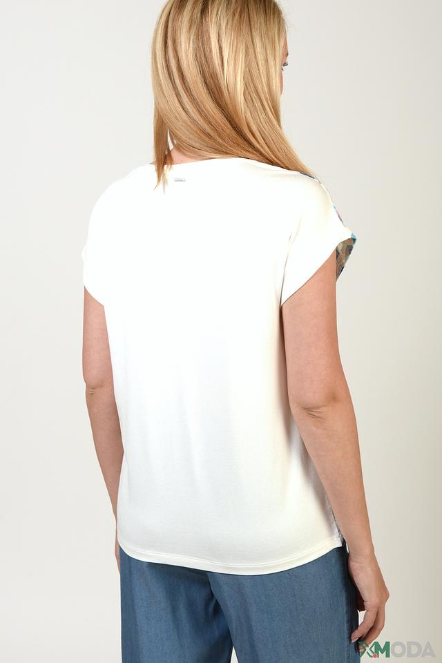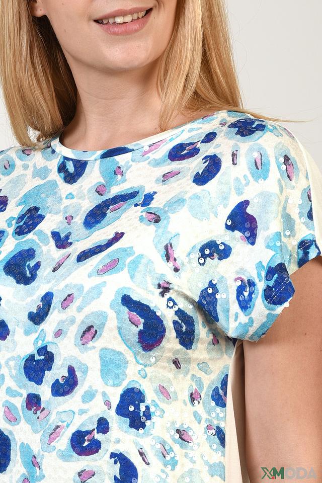Особенностью данной модели является яркий и необычный принт в виде абстрактных пятен голубых и синих оттенков на белом фоне. Футболка имеет короткий рукав с небольшим отворотом и округлый вырез горловины.