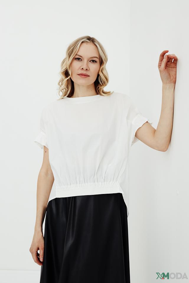Блуза имеет свободный крой, который не сковывает движения и обеспечивает комфорт в течение всего дня. Короткие рукава с воланами придают образу женственность и лёгкость. Сборка по низу добавляет оригинальности и акцентирует внимание на талии.