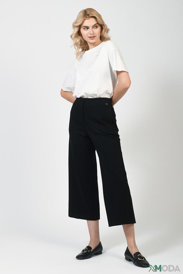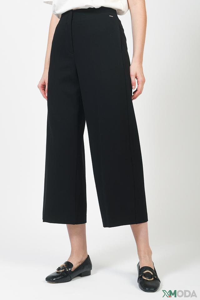 Брюки имеют прямой крой и завышенную талию, что визуально удлиняет ноги и подчеркивает фигуру. Широкие штанины обеспечивают свободу движений и создают лёгкий, воздушный силуэт. Застёжка на молнию и пуговицу гарантирует надежную фиксацию.