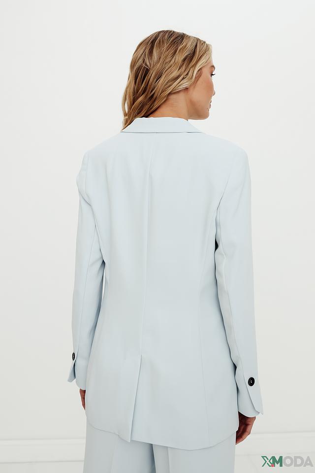 Жакет имеет приталенный силуэт, который выгодно подчеркивает достоинства фигуры. Застежка на две пуговицы обеспечивает удобство и надежность. Длинные рукава с аккуратными манжетами дополняют классический дизайн.
