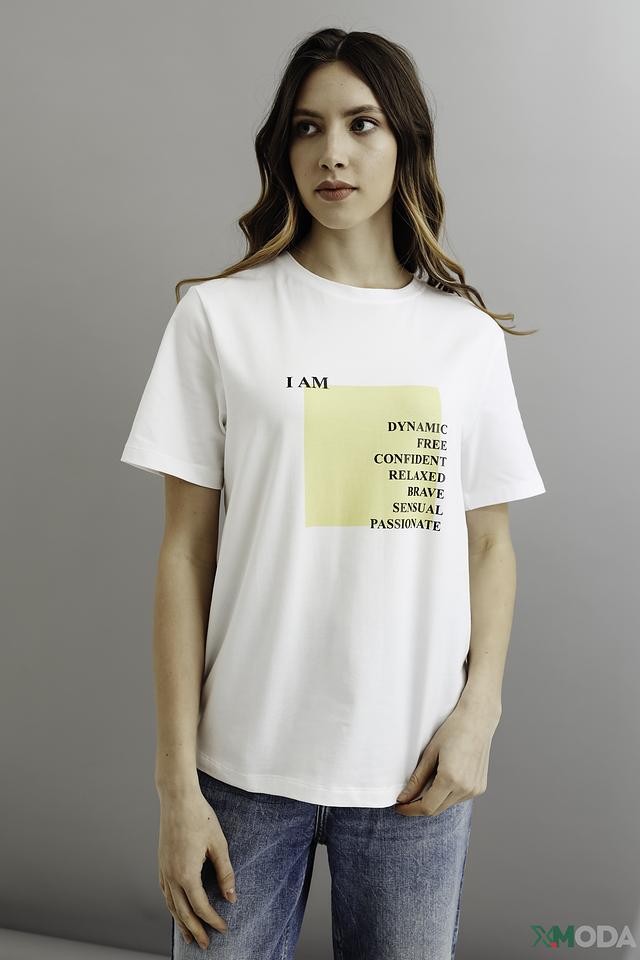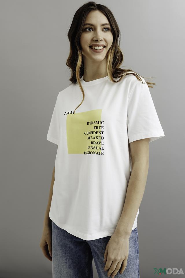 Особенностью данной модели является яркий графичный принт с надписью "I AM" и мотивационными словами, расположенный на передней части футболки. Принт выполнен в сочетании жёлтого и чёрного цветов, что добавляет изделию выразительности.
