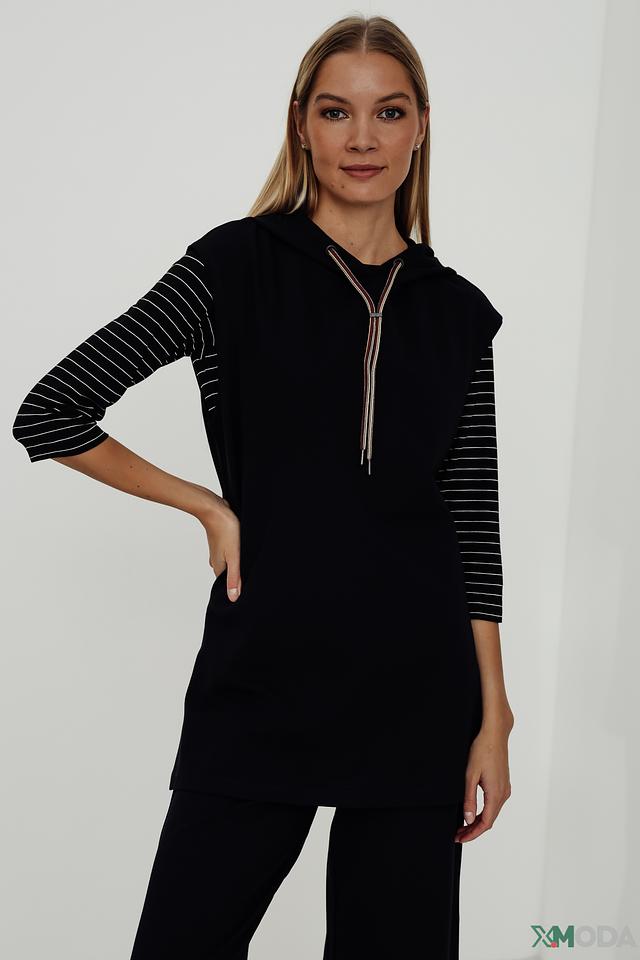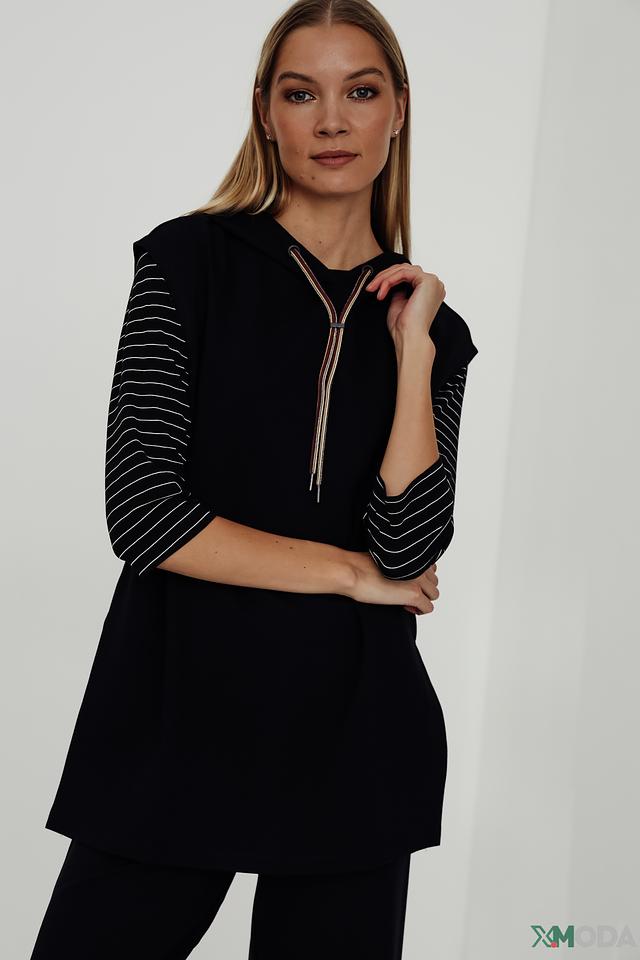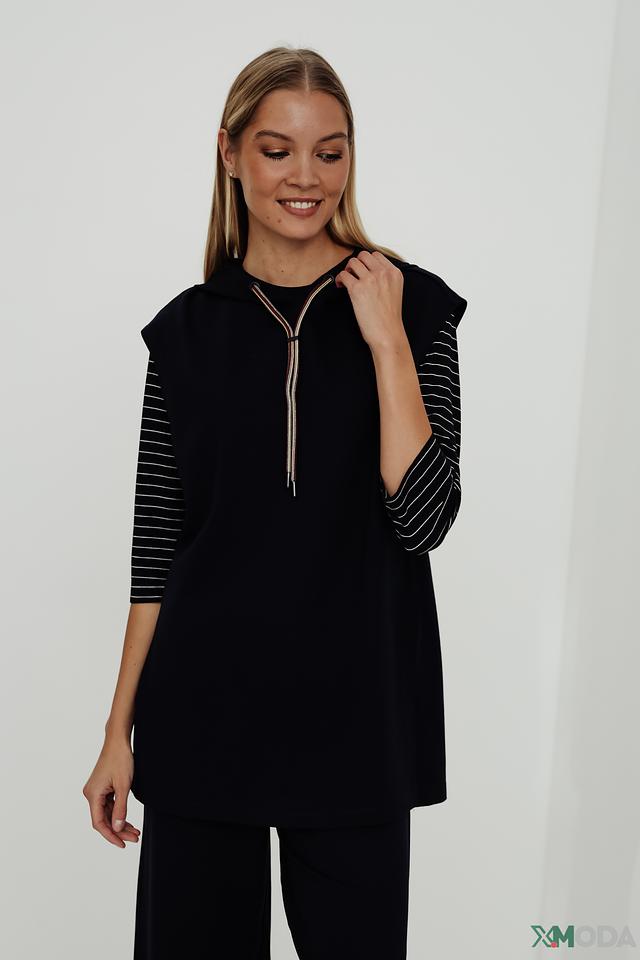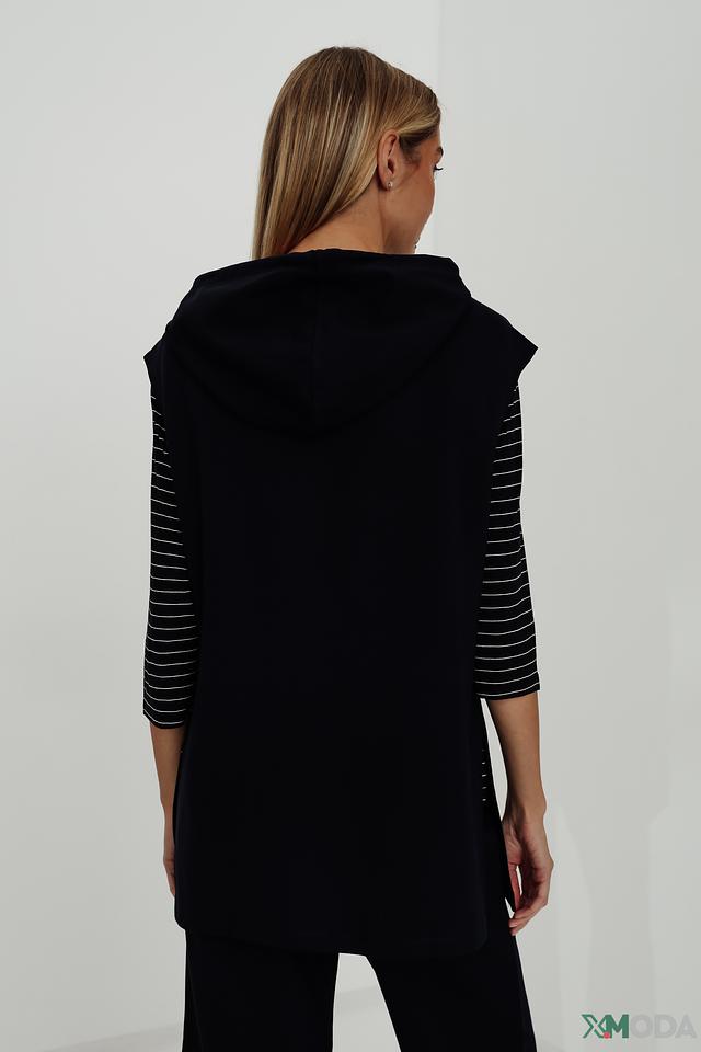 Этот жилет от Taifun станет отличным дополнением к вашему гардеробу. Он выполнен в классическом чёрном цвете и имеет удобный капюшон. Декоративные полоски на рукавах добавляют образу динамичности и оригинальности.