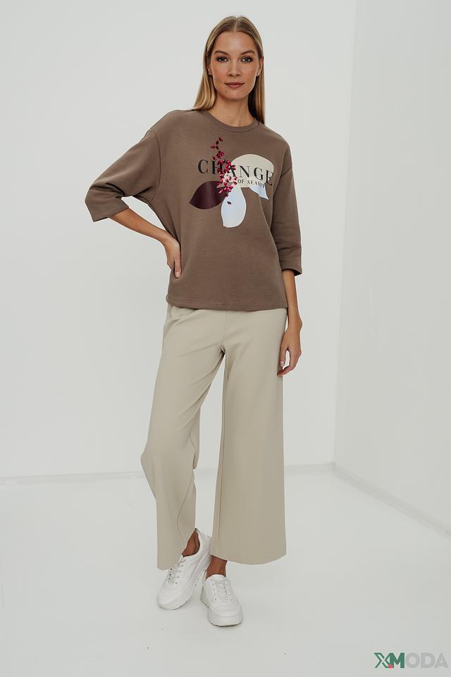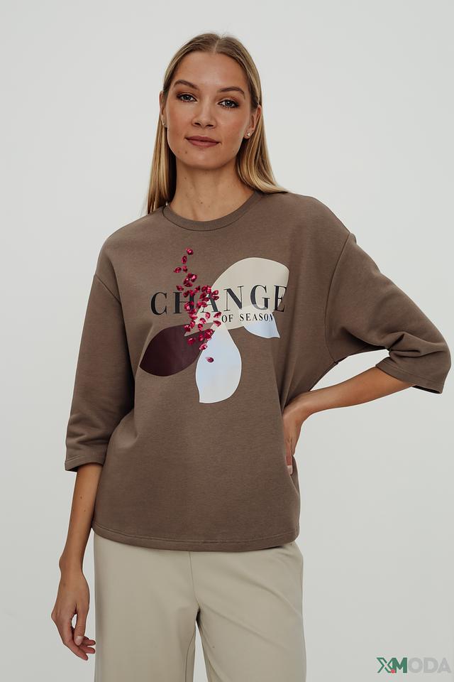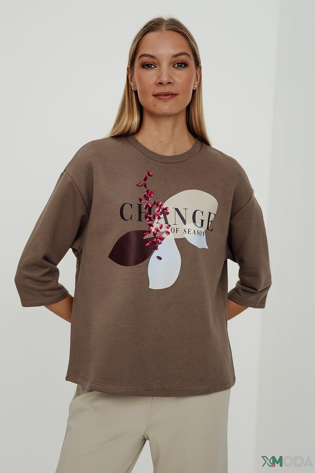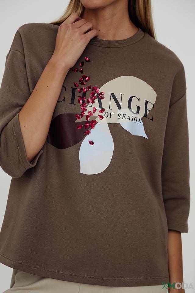 Передняя часть пуловера украшена ярким принтом с надписью "Change of Season" и изображением бабочки, выполненным в контрастных цветах. Принт добавляет изделию оригинальности и индивидуальности.