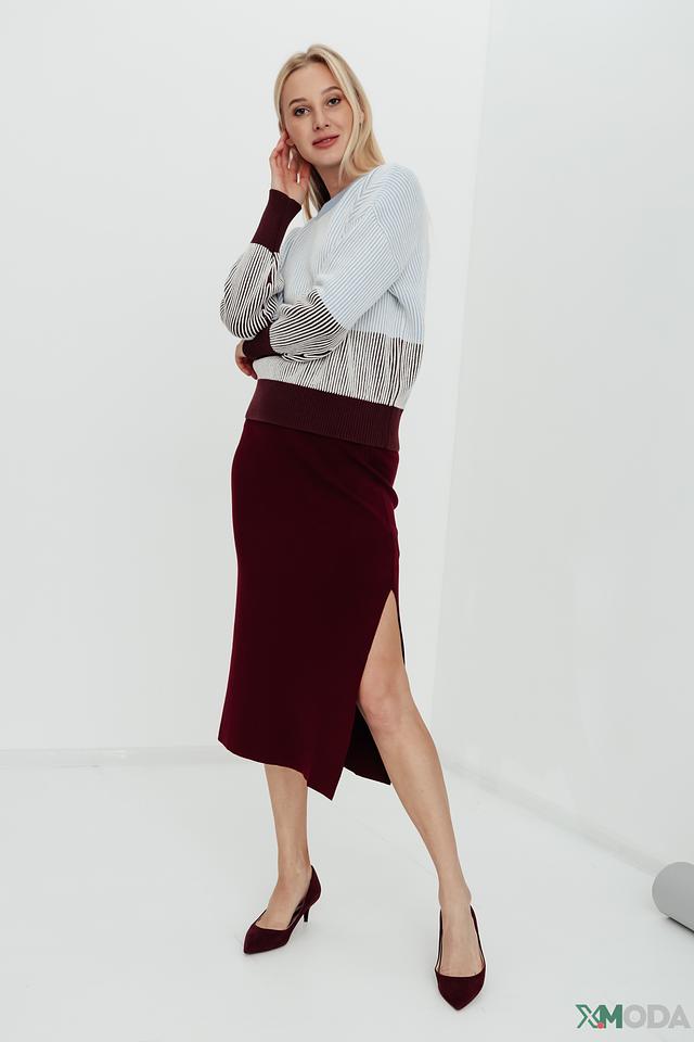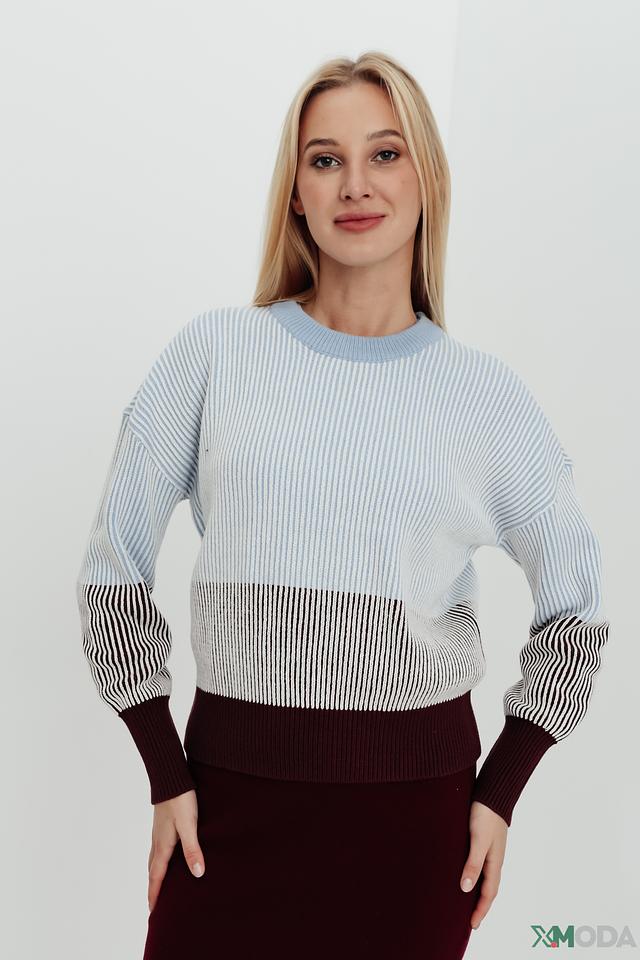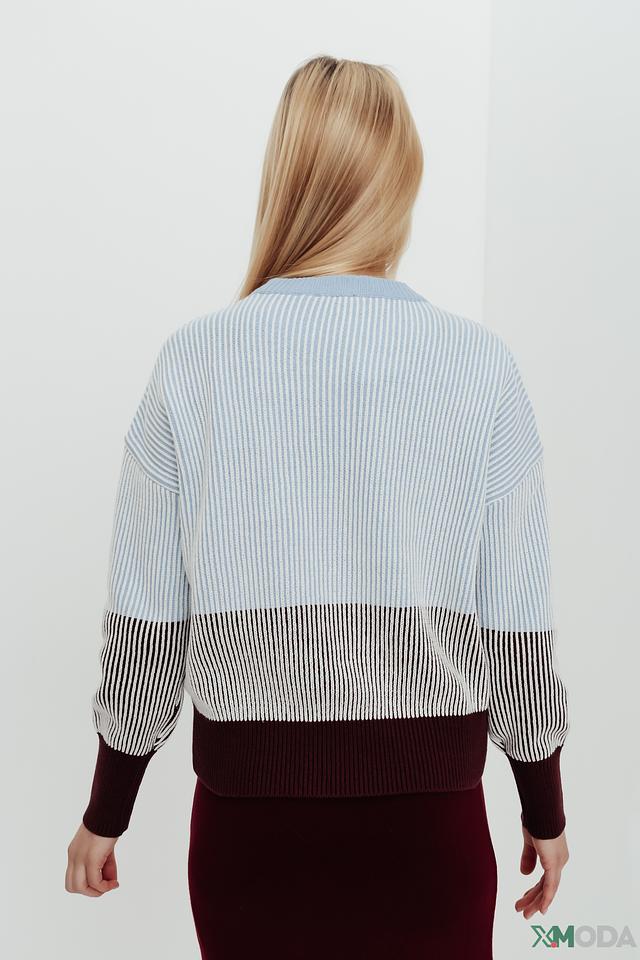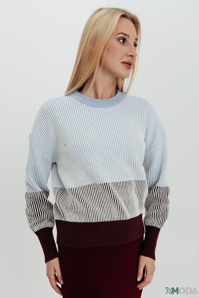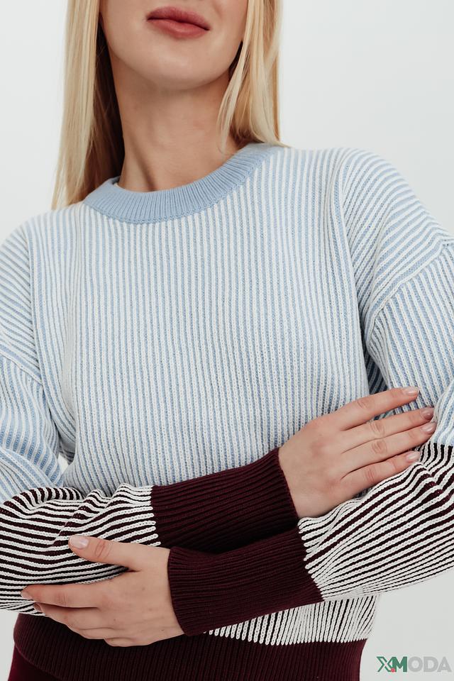 Пуловер имеет голубой цвет с вертикальной полоской, что придает ему свежий и современный вид. Бордовые манжеты и низ контрастируют с основным цветом, добавляя образу выразительности.