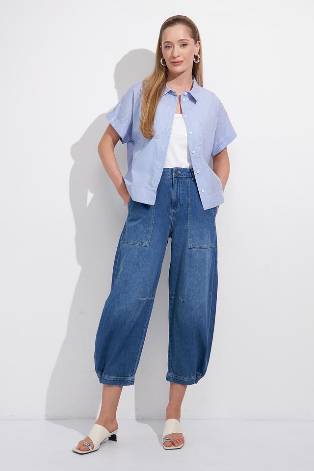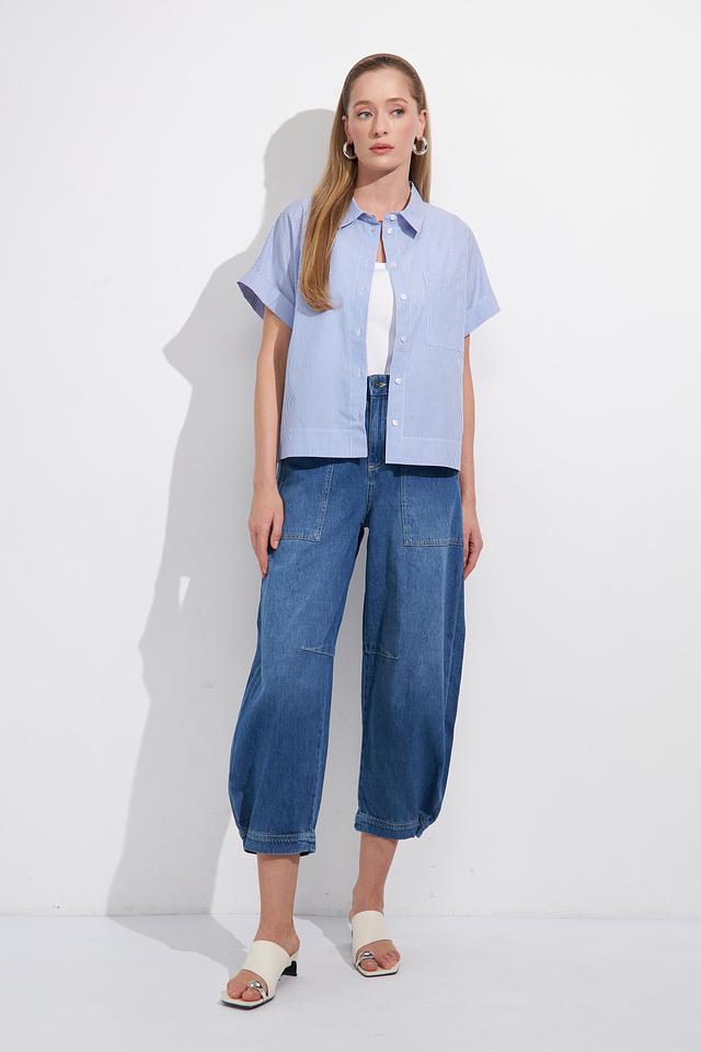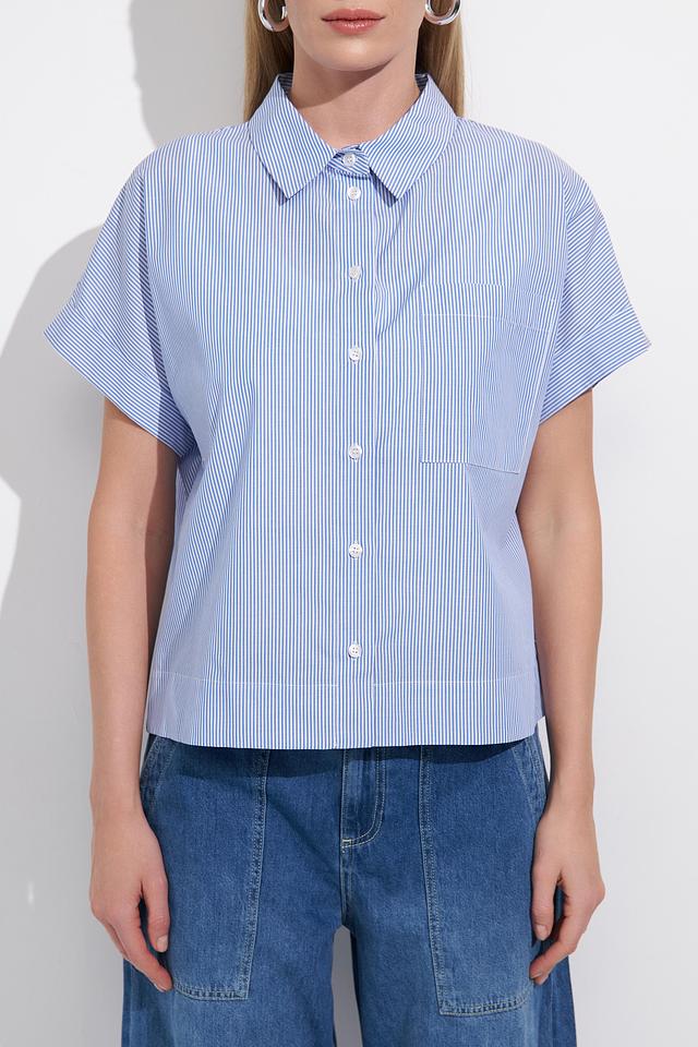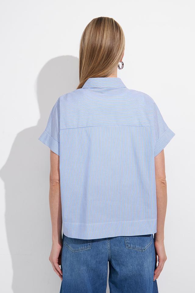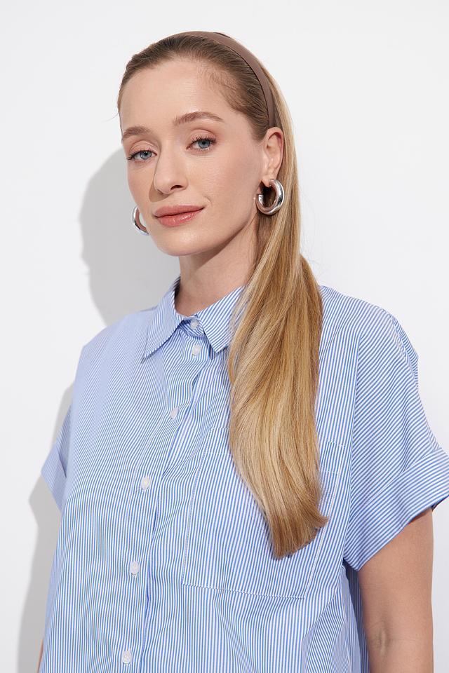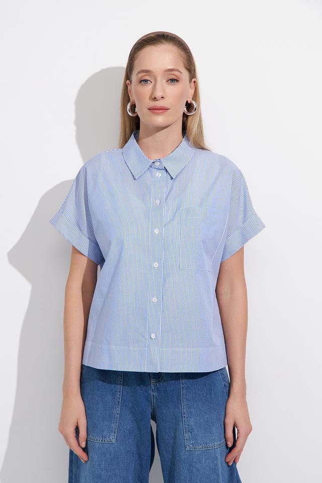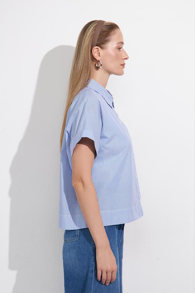 Блуза имеет классический крой с короткими рукавами и отложным воротником. Голубая полоска добавляет образу свежести и лёгкости. Застёжка на пуговицы позволяет регулировать степень прилегания.