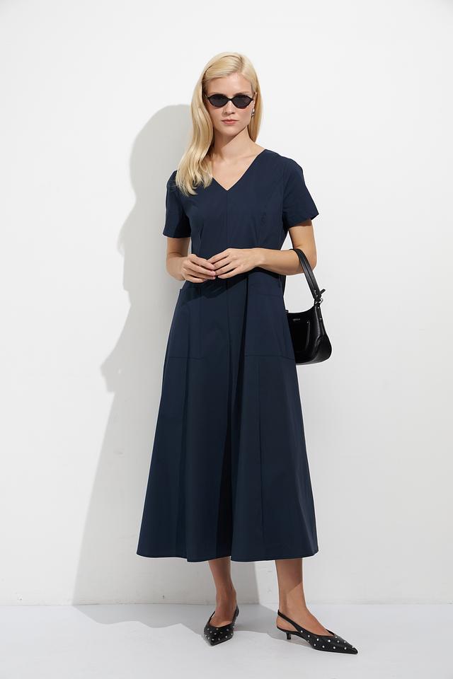 V-образный вырез горловины визуально удлиняет шею и добавляет образу женственности. Платье изготовлено из смесовой ткани, в состав которой входит 62% хлопка, 35% полиамида и 3% эластана. Хлопок обеспечивает мягкость и воздухопроницаемость, полиамид – износостойкость, а эластан – эластичность и комфортную посадку.