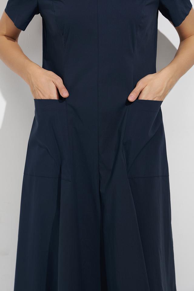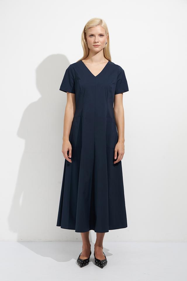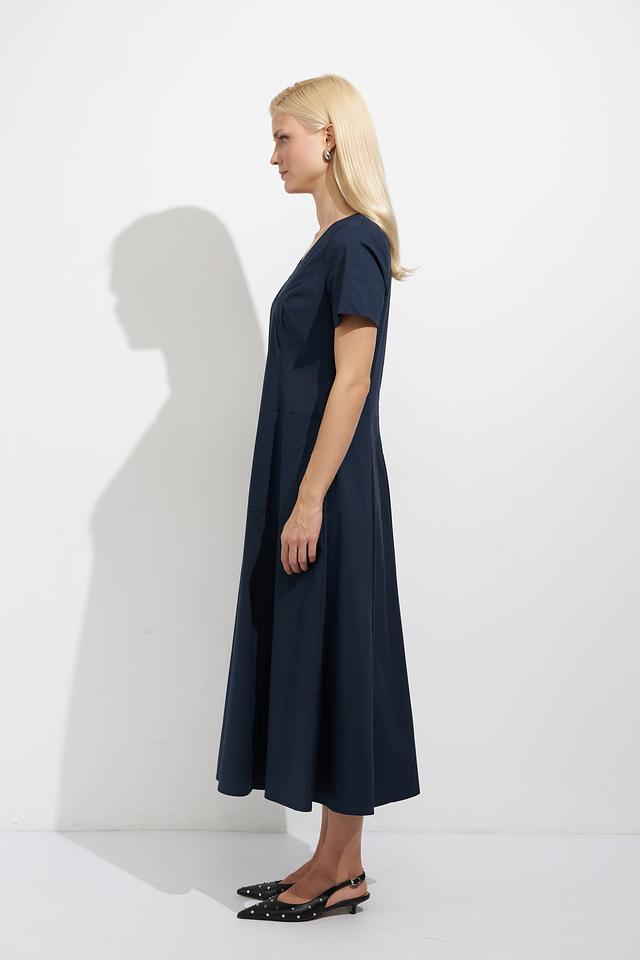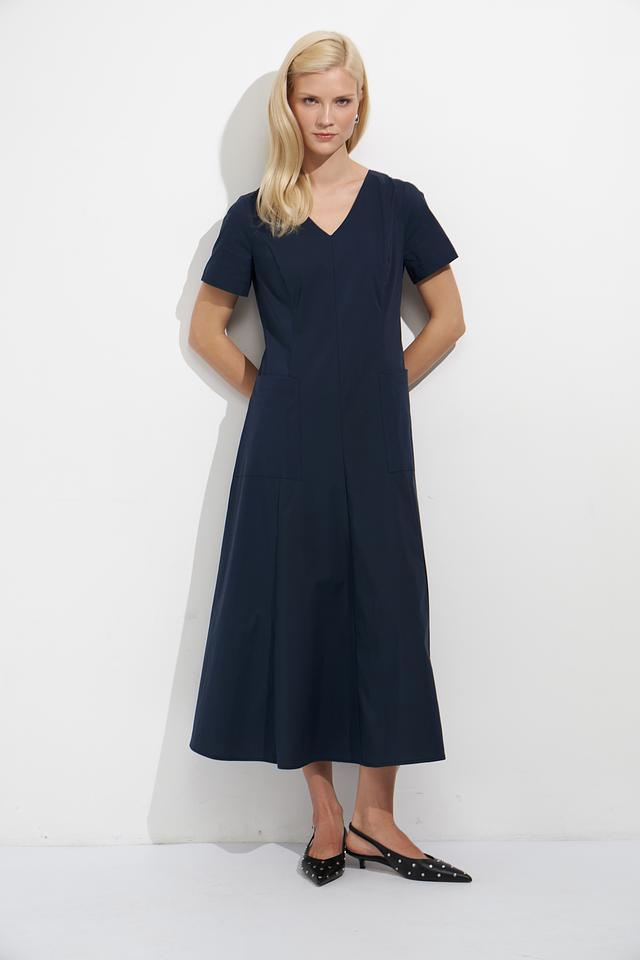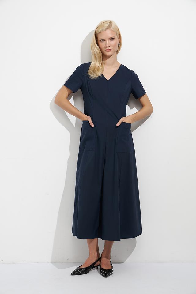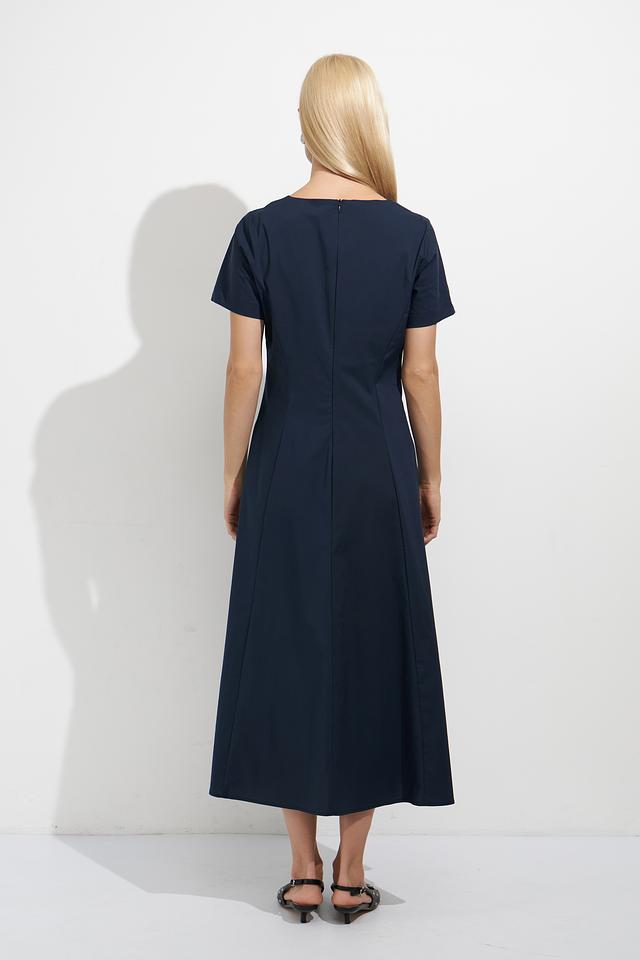 Это платье от Ten ways to be выполнено в классическом тёмно-синем цвете. Модель имеет прямой крой и короткие рукава, что делает его универсальным вариантом для различных случаев.