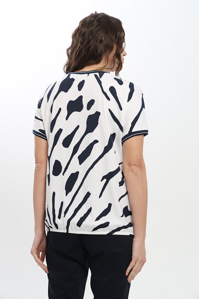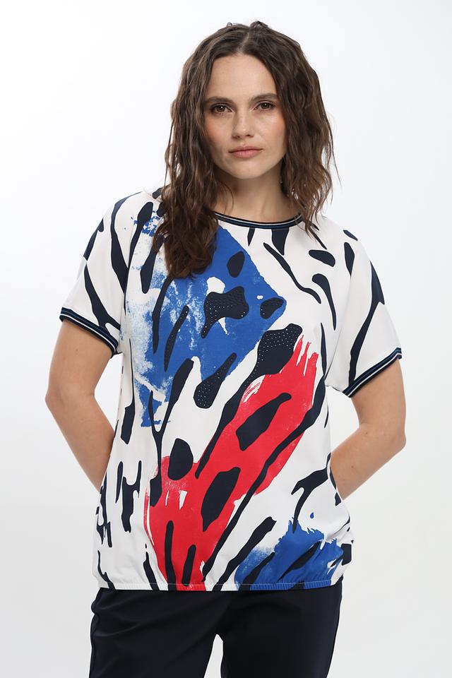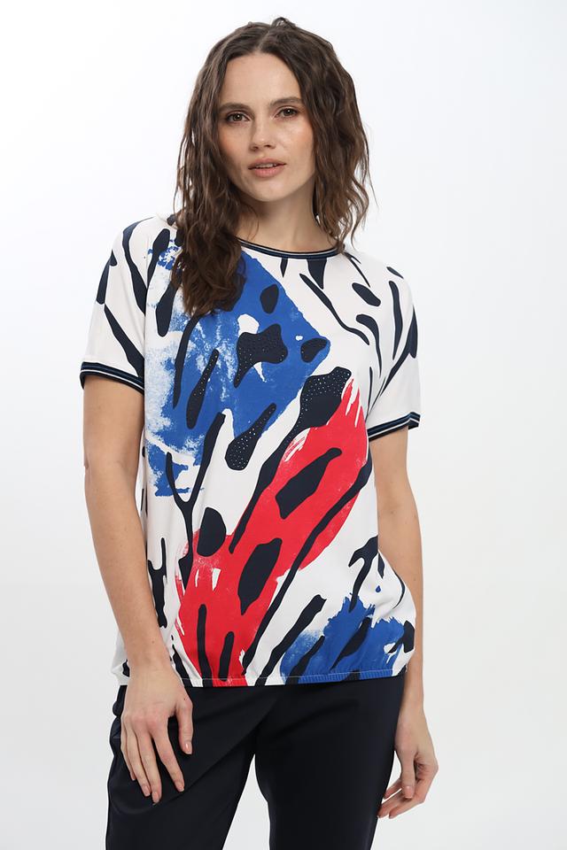 Женская футболка Thomas Rabe белого цвета с ярким абстрактным принтом. Модель выполнена из мягкого и приятного к телу сочетания хлопка, модала и эластана, обеспечивающего комфорт при носке. Состав: хлопок 48%, модал 48%, эластан 4%