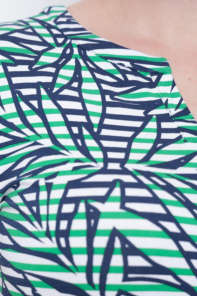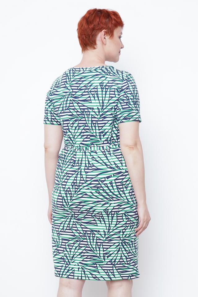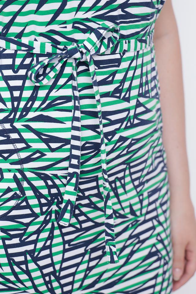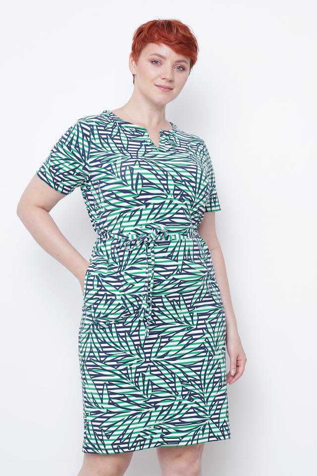 Особенностью этого платья является яркий и оригинальный принт в виде стилизованных листьев, выполненный в сочетании зеленого, белого и темно-синего цветов. Пояс в тон платья позволяет регулировать посадку и создавать более женственный силуэт.
