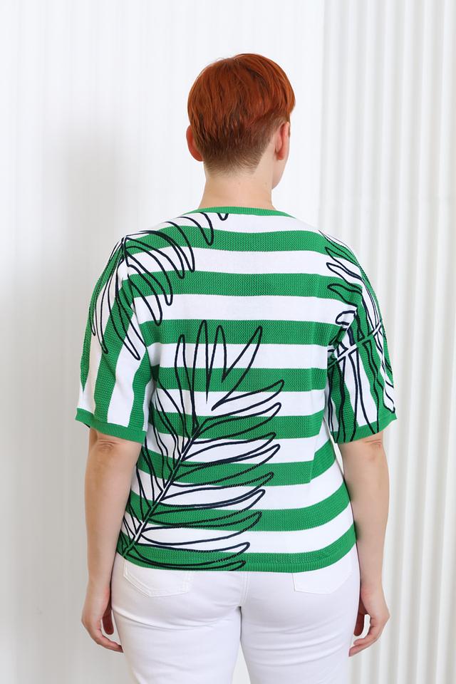 Основной цвет пуловера – зелёный, он сочетается с белыми полосами, создавая свежий и яркий образ. Декоративным элементом служит принт с изображением листьев, выполненный в чёрном цвете.