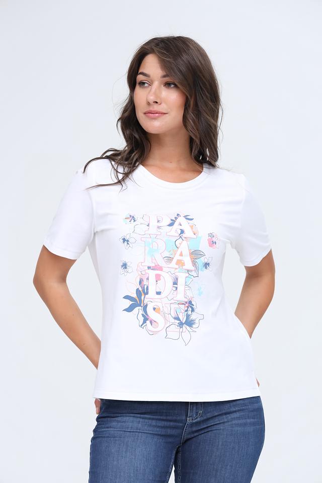 Белая футболка Thomas Rabe с ярким цветочным принтом и надписью "PARADISE". Изготовлена из мягкого хлопка с добавлением эластана для комфорта и свободы движений. Идеальный выбор для создания повседневного образа. Состав: хлопок 92%, эластан 8%