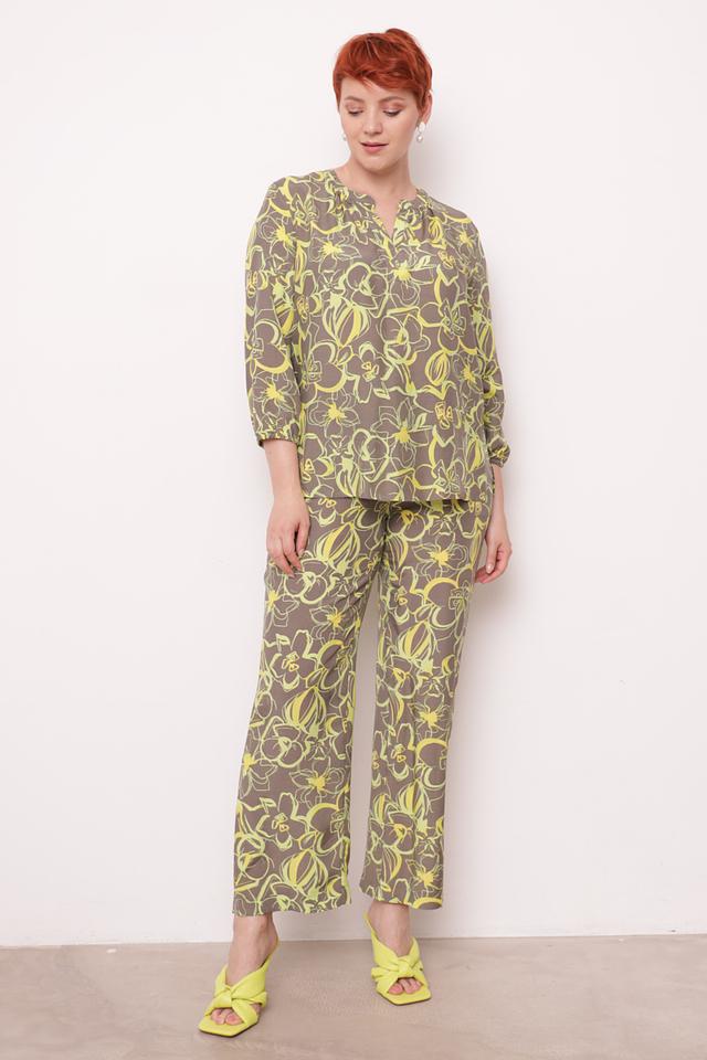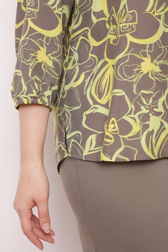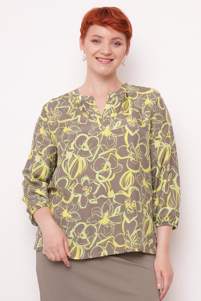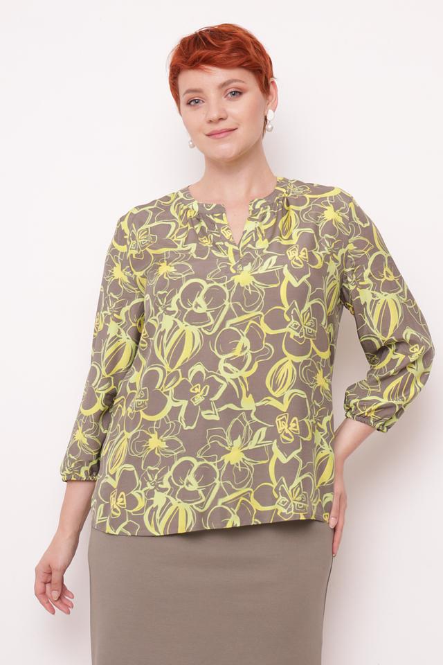 Основной цвет блузы – серый, а яркий цветочный принт добавляет образу женственности и игривости. V-образный вырез подчеркивает линию шеи и декольте, а рукава длиной 3/4 делают блузу универсальной для любого времени года. Блуза идеально сочетается с юбками, брюками и джинсами, позволяя создавать разнообразные образы.